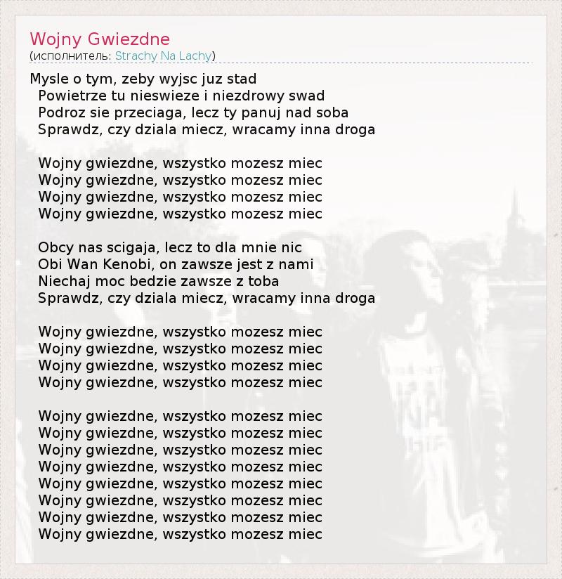 Mysle o tym, zeby wyjsc juz stad Powietrze tu nieswieze i niezdrowy swad Podroz sie przeciaga, lecz ty panuj nad soba Sprawdz, czy dziala miecz, wracamy inna droga Wojny gwiezdne, wszystko mozesz miec Wojny gwiezdne, wszystko mozesz miec Wojny gwiezdne, wszystko mozesz miec Wojny gwiezdne, wszystko mozesz miec Obcy nas scigaja, lecz to dla mnie nic Obi Wan Kenobi, on zawsze jest z nami Niechaj moc bedzie zawsze z toba Sprawdz, czy dziala miecz, wracamy inna droga Wojny gwiezdne, wszystko mozesz miec Wojny gwiezdne, wszystko mozesz miec Wojny gwiezdne, wszystko mozesz miec Wojny gwiezdne, wszystko mozesz miec Wojny gwiezdne, wszystko mozesz miec Wojny gwiezdne, wszystko mozesz miec Wojny gwiezdne, wszystko mozesz miec Wojny gwiezdne, wszystko mozesz miec Wojny gwiezdne, wszystko mozesz miec Wojny gwiezdne, wszystko mozesz miec Wojny gwiezdne, wszystko mozesz miec Wojny gwiezdne, wszystko mozesz miec
