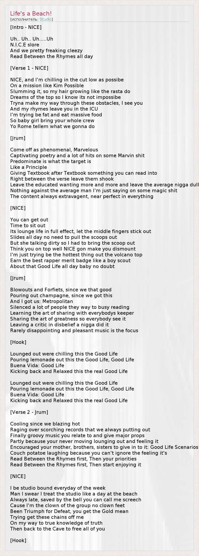 [Intro - NICE] Uh.. Uh.. Uh.....Uh N.I.C.E slore And we pretty freaking cleezy Read Between the Rhymes all day [Verse 1 - NICE] NICE, and I'm chilling in the cut low as possibe On a mission like Kim Possible Slumming it, so my hair growing like the rasta do Dreams of the top so I know its not impossibe Tryna make my way through these obstacles, I see you And my rhymes leave you in the ICU I'm trying be fat and eat massive food So baby girl bring your whole crew Yo Rome tellem what we gonna do [Jrum] Come off as phenomenal, Marvelous Captivating poetry and a lot of hits on some Marvin shit Predominate is what the target is Like a Principle Giving Textbook after Textbook something you can read into Right between the verse leave them shook Leave the educated wanting more and more and leave the average nigga dull Nothing against the average man I'm just saying on some magic shit The content always extravagent, near perfect in everything [NICE] You can get out Time to sit out Its lounge life in full effect, let the middle fingers stick out Slides all day no need to pull the scoops out But she talking dirty so I had to bring the scoop out Think you on top well NICE gon make you dismount I'm just trying be the hottest thing out the volcano top Earn the best rapper merit badge like a boy scout About that Good Life all day baby no doubt [Jrum] Blowouts and Forfiets, since we that good Pouring out champagne, since we got this And I got us: Metropolitan Silenced a lot of people they way to busy reading Learning the art of sharing with everybodys keeper Sharing the art of greatness so everybody see it Leaving a critic in disbelief a nigga did it Rarely disappointing and pleasant music is the focus [Hook] Lounged out were chilling this the Good Life Pouring lemonade out this the Good Life, Good Life Buena Vida: Good Life Kicking back and Relaxed this the real Good Life Lounged out were chilling this the Good Life Pouring lemonade out this the Good Life, Good Life Buena Vida: Good Life Kicking back and Relaxed this the real Good Life [Verse 2 - Jrum] Cooling since we blazing hot Raging over scorching records that we always putting out Finally groovy music you relate to and give major props Partly because your never moving lounging out and feeling it Encouraged your mother, brothers, sisters to give in to it: Good Life Scenarios Couch potatoe laughing because you can't ignore the feeling it's Read Between the Rhymes first, Then your priorities Read Between the Rhymes first, Then start enjoying it [NICE] I be studio bound everyday of the week Man I swear I treat the studio like a day at the beach Always late, saved by the bell you can call me screech Cause I'm the clown of the group no clown feet Been Triumph for Defeat, you get the Gold mean Trying get these chains off me On my way to true knowledge of truth Then back to the Cave to free all of you [Hook]