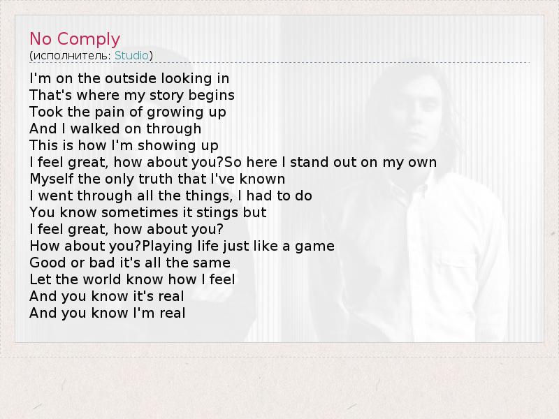 I'm on the outside looking in That's where my story begins Took the pain of growing up And I walked on through This is how I'm showing up I feel great, how about you?So here I stand out on my own Myself the only truth that I've known I went through all the things, I had to do You know sometimes it stings but I feel great, how about you? How about you?Playing life just like a game Good or bad it's all the same Let the world know how I feel And you know it's real And you know I'm real