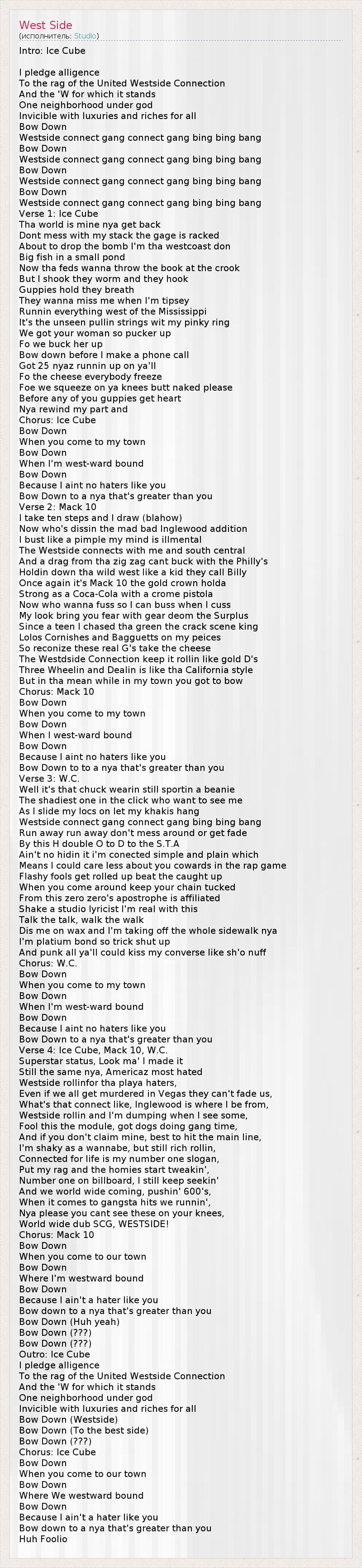 Intro: Ice Cube I pledge alligence To the rag of the United Westside Connection And the 'W for which it stands One neighborhood under god Invicible with luxuries and riches for all Bow Down Westside connect gang connect gang bing bing bang Bow Down Westside connect gang connect gang bing bing bang Bow Down Westside connect gang connect gang bing bing bang Bow Down Westside connect gang connect gang bing bing bang Verse 1: Ice Cube Tha world is mine nya get back Dont mess with my stack the gage is racked About to drop the bomb I'm tha westcoast don Big fish in a small pond Now tha feds wanna throw the book at the crook But I shook they worm and they hook Guppies hold they breath They wanna miss me when I'm tipsey Runnin everything west of the Mississippi It's the unseen pullin strings wit my pinky ring We got your woman so pucker up Fo we buck her up Bow down before I make a phone call Got 25 nyaz runnin up on ya'll Fo the cheese everybody freeze Foe we squeeze on ya knees butt naked please Before any of you guppies get heart Nya rewind my part and Chorus: Ice Cube Bow Down When you come to my town Bow Down When I'm west-ward bound Bow Down Because I aint no haters like you Bow Down to a nya that's greater than you Verse 2: Mack 10 I take ten steps and I draw (blahow) Now who's dissin the mad bad Inglewood addition I bust like a pimple my mind is illmental The Westside connects with me and south central And a drag from tha zig zag cant buck with the Philly's Holdin down tha wild west like a kid they call Billy Once again it's Mack 10 the gold crown holda Strong as a Coca-Cola with a crome pistola Now who wanna fuss so I can buss when I cuss My look bring you fear with gear deom the Surplus Since a teen I chased tha green the crack scene king Lolos Cornishes and Bagguetts on my peices So reconize these real G's take the cheese The Westdside Connection keep it rollin like gold D's Three Wheelin and Dealin is like tha California style But in tha mean while in my town you got to bow Chorus: Mack 10 Bow Down When you come to my town Bow Down When I west-ward bound Bow Down Because I aint no haters like you Bow Down to to a nya that's greater than you Verse 3: W.C. Well it's that chuck wearin still sportin a beanie The shadiest one in the click who want to see me As I slide my locs on let my khakis hang Westside connect gang connect gang bing bing bang Run away run away don't mess around or get fade By this H double O to D to the S.T.A Ain't no hidin it i'm conected simple and plain which Means I could care less about you cowards in the rap game Flashy fools get rolled up beat the caught up When you come around keep your chain tucked From this zero zero's apostrophe is affiliated Shake a studio lyricist I'm real with this Talk the talk, walk the walk Dis me on wax and I'm taking off the whole sidewalk nya I'm platium bond so trick shut up And punk all ya'll could kiss my converse like sh'o nuff Chorus: W.C. Bow Down When you come to my town Bow Down When I'm west-ward bound Bow Down Because I aint no haters like you Bow Down to a nya that's greater than you Verse 4: Ice Cube, Mack 10, W.C. Superstar status, Look ma' I made it Still the same nya, Americaz most hated Westside rollinfor tha playa haters, Even if we all get murdered in Vegas they can't fade us, What's that connect like, Inglewood is where I be from, Westside rollin and I'm dumping when I see some, Fool this the module, got dogs doing gang time, And if you don't claim mine, best to hit the main line, I'm shaky as a wannabe, but still rich rollin, Connected for life is my number one slogan, Put my rag and the homies start tweakin', Number one on billboard, I still keep seekin' And we world wide coming, pushin' 600's, When it comes to gangsta hits we runnin', Nya please you cant see these on your knees, World wide dub SCG, WESTSIDE! Chorus: Mack 10 Bow Down When you come to our town Bow Down Where I'm westward bound Bow Down Because I ain't a hater like you Bow down to a nya that's greater than you Bow Down (Huh yeah) Bow Down (???) Bow Down (???) Outro: Ice Cube I pledge alligence To the rag of the United Westside Connection And the 'W for which it stands One neighborhood under god Invicible with luxuries and riches for all Bow Down (Westside) Bow Down (To the best side) Bow Down (???) Chorus: Ice Cube Bow Down When you come to our town Bow Down Where We westward bound Bow Down Because I ain't a hater like you Bow down to a nya that's greater than you Huh Foolio