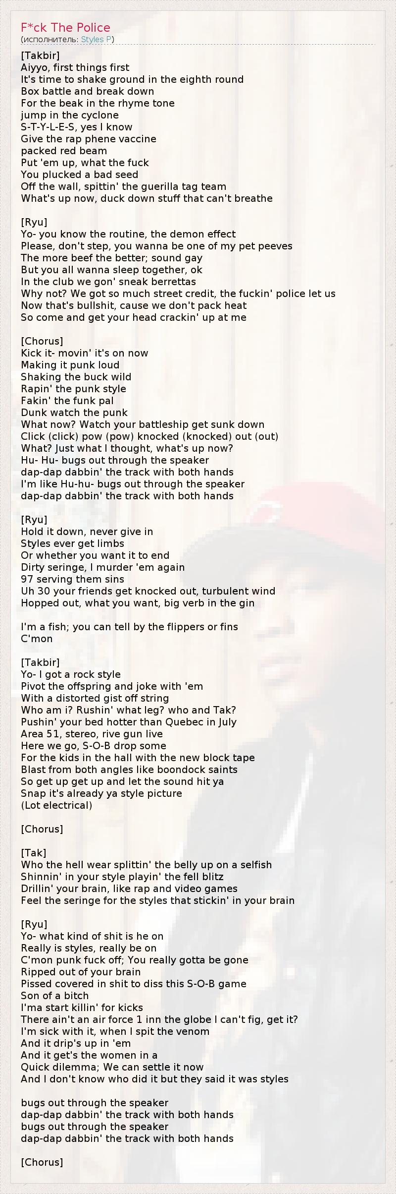 [Takbir] Aiyyo, first things first It's time to shake ground in the eighth round Box battle and break down For the beak in the rhyme tone jump in the cyclone S-T-Y-L-E-S, yes I know Give the rap phene vaccine packed red beam Put 'em up, what the fuck You plucked a bad seed Off the wall, spittin' the guerilla tag team What's up now, duck down stuff that can't breathe [Ryu] Yo- you know the routine, the demon effect Please, don't step, you wanna be one of my pet peeves The more beef the better; sound gay But you all wanna sleep together, ok In the club we gon' sneak berrettas Why not? We got so much street credit, the fuckin' police let us Now that's bullshit, cause we don't pack heat So come and get your head crackin' up at me [Chorus] Kick it- movin' it's on now Making it punk loud Shaking the buck wild Rapin' the punk style Fakin' the funk pal Dunk watch the punk What now? Watch your battleship get sunk down Click (click) pow (pow) knocked (knocked) out (out) What? Just what I thought, what's up now? Hu- Hu- bugs out through the speaker dap-dap dabbin' the track with both hands I'm like Hu-hu- bugs out through the speaker dap-dap dabbin' the track with both hands [Ryu] Hold it down, never give in Styles ever get limbs Or whether you want it to end Dirty seringe, I murder 'em again 97 serving them sins Uh 30 your friends get knocked out, turbulent wind Hopped out, what you want, big verb in the gin I'm a fish; you can tell by the flippers or fins C'mon [Takbir] Yo- I got a rock style Pivot the offspring and joke with 'em With a distorted gist off string Who am i? Rushin' what leg? who and Tak? Pushin' your bed hotter than Quebec in July Area 51, stereo, rive gun live Here we go, S-O-B drop some For the kids in the hall with the new block tape Blast from both angles like boondock saints So get up get up and let the sound hit ya Snap it's already ya style picture (Lot electrical) [Chorus] [Tak] Who the hell wear splittin' the belly up on a selfish Shinnin' in your style playin' the fell blitz Drillin' your brain, like rap and video games Feel the seringe for the styles that stickin' in your brain [Ryu] Yo- what kind of shit is he on Really is styles, really be on C'mon punk fuck off; You really gotta be gone Ripped out of your brain Pissed covered in shit to diss this S-O-B game Son of a bitch I'ma start killin' for kicks There ain't an air force 1 inn the globe I can't fig, get it? I'm sick with it, when I spit the venom And it drip's up in 'em And it get's the women in a Quick dilemma; We can settle it now And I don't know who did it but they said it was styles bugs out through the speaker dap-dap dabbin' the track with both hands bugs out through the speaker dap-dap dabbin' the track with both hands [Chorus]