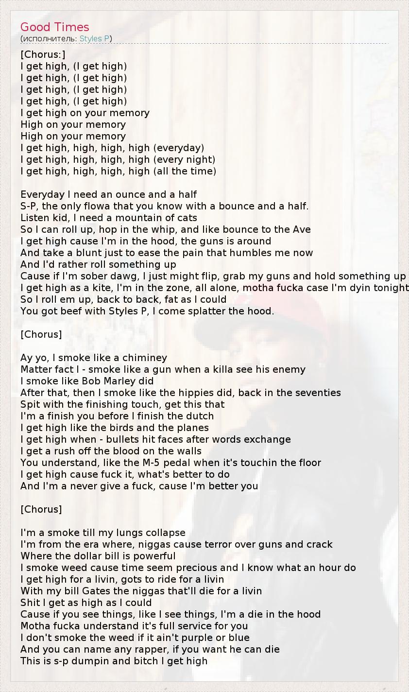 [Chorus:] I get high, (I get high) I get high, (I get high) I get high, (I get high) I get high, (I get high) I get high on your memory High on your memory High on your memory I get high, high, high, high (everyday) I get high, high, high, high (every night) I get high, high, high, high (all the time) Everyday I need an ounce and a half S-P, the only flowa that you know with a bounce and a half. Listen kid, I need a mountain of cats So I can roll up, hop in the whip, and like bounce to the Ave I get high cause I'm in the hood, the guns is around And take a blunt just to ease the pain that humbles me now And I'd rather roll something up Cause if I'm sober dawg, I just might flip, grab my guns and hold something up I get high as a kite, I'm in the zone, all alone, motha fucka case I'm dyin tonight So I roll em up, back to back, fat as I could You got beef with Styles P, I come splatter the hood. [Chorus] Ay yo, I smoke like a chiminey Matter fact I - smoke like a gun when a killa see his enemy I smoke like Bob Marley did After that, then I smoke like the hippies did, back in the seventies Spit with the finishing touch, get this that I'm a finish you before I finish the dutch I get high like the birds and the planes I get high when - bullets hit faces after words exchange I get a rush off the blood on the walls You understand, like the M-5 pedal when it's touchin the floor I get high cause fuck it, what's better to do And I'm a never give a fuck, cause I'm better you [Chorus] I'm a smoke till my lungs collapse I'm from the era where, niggas cause terror over guns and crack Where the dollar bill is powerful I smoke weed cause time seem precious and I know what an hour do I get high for a livin, gots to ride for a livin With my bill Gates the niggas that'll die for a livin Shit I get as high as I could Cause if you see things, like I see things, I'm a die in the hood Motha fucka understand it's full service for you I don't smoke the weed if it ain't purple or blue And you can name any rapper, if you want he can die This is s-p dumpin and bitch I get high
