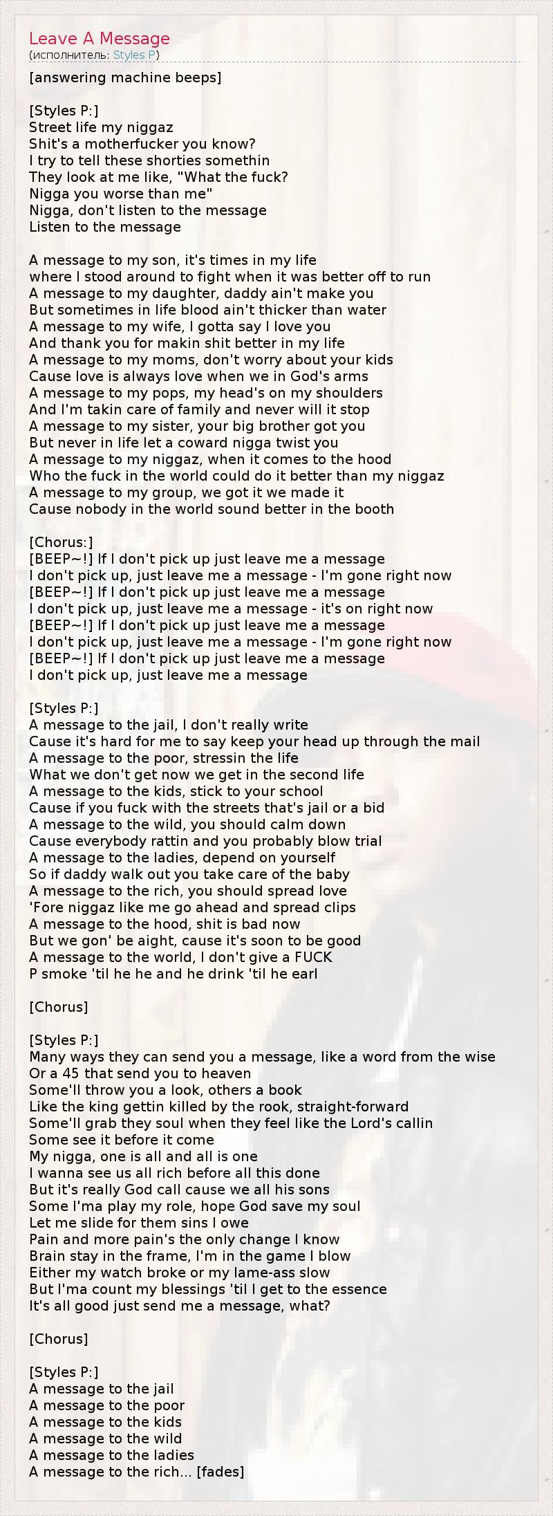 [answering machine beeps] [Styles P:] Street life my niggaz Shit's a motherfucker you know? I try to tell these shorties somethin They look at me like, "What the fuck? Nigga you worse than me" Nigga, don't listen to the message Listen to the message A message to my son, it's times in my life where I stood around to fight when it was better off to run A message to my daughter, daddy ain't make you But sometimes in life blood ain't thicker than water A message to my wife, I gotta say I love you And thank you for makin shit better in my life A message to my moms, don't worry about your kids Cause love is always love when we in God's arms A message to my pops, my head's on my shoulders And I'm takin care of family and never will it stop A message to my sister, your big brother got you But never in life let a coward nigga twist you A message to my niggaz, when it comes to the hood Who the fuck in the world could do it better than my niggaz A message to my group, we got it we made it Cause nobody in the world sound better in the booth [Chorus:] [BEEP~!] If I don't pick up just leave me a message I don't pick up, just leave me a message - I'm gone right now [BEEP~!] If I don't pick up just leave me a message I don't pick up, just leave me a message - it's on right now [BEEP~!] If I don't pick up just leave me a message I don't pick up, just leave me a message - I'm gone right now [BEEP~!] If I don't pick up just leave me a message I don't pick up, just leave me a message [Styles P:] A message to the jail, I don't really write Cause it's hard for me to say keep your head up through the mail A message to the poor, stressin the life What we don't get now we get in the second life A message to the kids, stick to your school Cause if you fuck with the streets that's jail or a bid A message to the wild, you should calm down Cause everybody rattin and you probably blow trial A message to the ladies, depend on yourself So if daddy walk out you take care of the baby A message to the rich, you should spread love 'Fore niggaz like me go ahead and spread clips A message to the hood, shit is bad now But we gon' be aight, cause it's soon to be good A message to the world, I don't give a FUCK P smoke 'til he he and he drink 'til he earl [Chorus] [Styles P:] Many ways they can send you a message, like a word from the wise Or a 45 that send you to heaven Some'll throw you a look, others a book Like the king gettin killed by the rook, straight-forward Some'll grab they soul when they feel like the Lord's callin Some see it before it come My nigga, one is all and all is one I wanna see us all rich before all this done But it's really God call cause we all his sons Some I'ma play my role, hope God save my soul Let me slide for them sins I owe Pain and more pain's the only change I know Brain stay in the frame, I'm in the game I blow Either my watch broke or my lame-ass slow But I'ma count my blessings 'til I get to the essence It's all good just send me a message, what? [Chorus] [Styles P:] A message to the jail A message to the poor A message to the kids A message to the wild A message to the ladies A message to the rich... [fades]