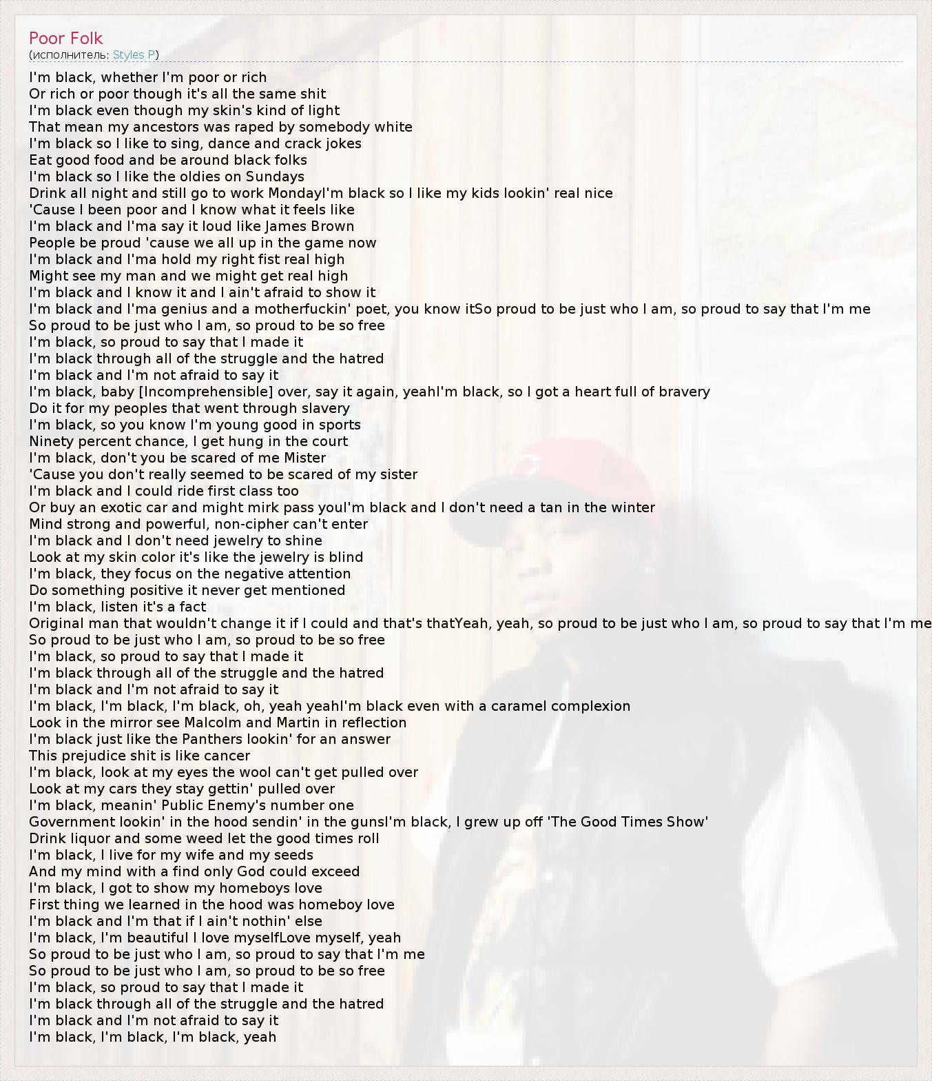 Это интересно:Стайлс Пи (англ. Styles P) — известный американский рэппер, настоящее имя Дэвид Стайлс. Родился 28 ноября 1974 г. в Квинсе, в семье американца и африканки. Стайлс Пи является членом хип-хоп группы D-Block (ранее известная как The L.O.X.), в которую помимо него входят Джейдэкисс (англ. Jadakiss) и Шик Лауч (англ. Sheek Louch). Песни Стайлса Пи известны их откровенностью и громкими заявлениями... продолжение