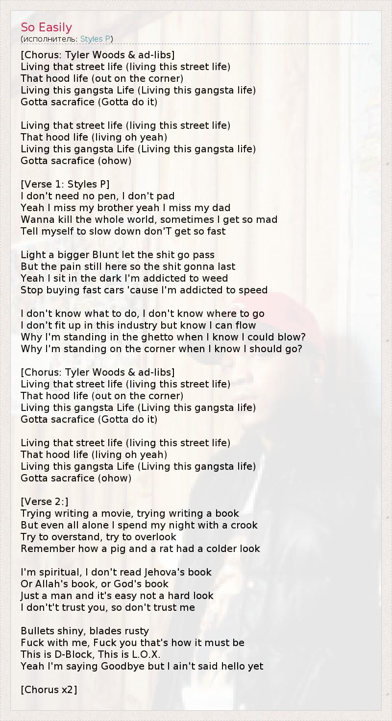 Это интересно:Стайлс Пи (англ. Styles P) — известный американский рэппер, настоящее имя Дэвид Стайлс. Родился 28 ноября 1974 г. в Квинсе, в семье американца и африканки. Стайлс Пи является членом хип-хоп группы D-Block (ранее известная как The L.O.X.), в которую помимо него входят Джейдэкисс (англ. Jadakiss) и Шик Лауч (англ. Sheek Louch). Песни Стайлса Пи известны их откровенностью и громкими заявлениями... продолжение