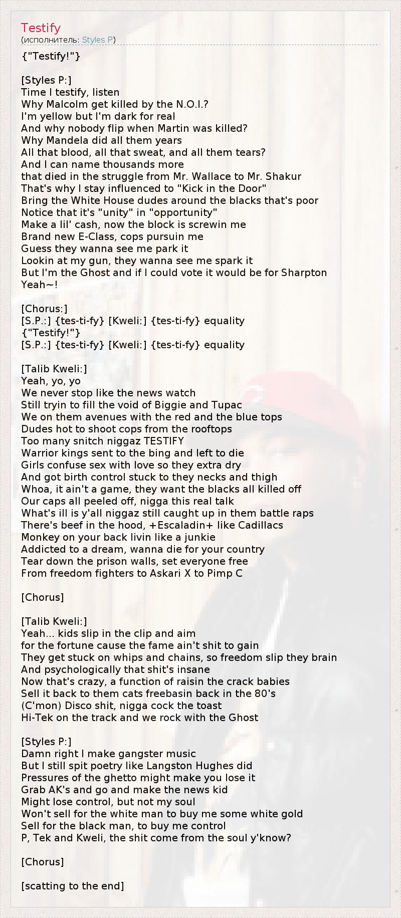 Это интересно:Стайлс Пи (англ. Styles P) — известный американский рэппер, настоящее имя Дэвид Стайлс. Родился 28 ноября 1974 г. в Квинсе, в семье американца и африканки. Стайлс Пи является членом хип-хоп группы D-Block (ранее известная как The L.O.X.), в которую помимо него входят Джейдэкисс (англ. Jadakiss) и Шик Лауч (англ. Sheek Louch). Песни Стайлса Пи известны их откровенностью и громкими заявлениями... продолжение