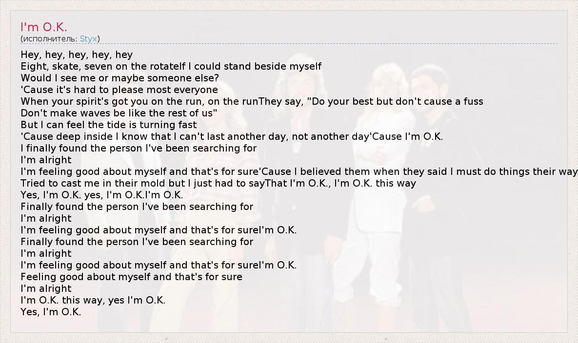 Hey, hey, hey, hey, hey Eight, skate, seven on the rotateIf I could stand beside myself Would I see me or maybe someone else? 'Cause it's hard to please most everyone When your spirit's got you on the run, on the runThey say, "Do your best but don't cause a fuss Don't make waves be like the rest of us" But I can feel the tide is turning fast 'Cause deep inside I know that I can't last another day, not another day'Cause I'm O.K. I finally found the person I've been searching for I'm alright I'm feeling good about myself and that's for sure'Cause I believed them when they said I must do things their way Tried to cast me in their mold but I just had to sayThat I'm O.K., I'm O.K. this way Yes, I'm O.K. yes, I'm O.K.I'm O.K. Finally found the person I've been searching for I'm alright I'm feeling good about myself and that's for sureI'm O.K. Finally found the person I've been searching for I'm alright I'm feeling good about myself and that's for sureI'm O.K. Feeling good about myself and that's for sure I'm alright I'm O.K. this way, yes I'm O.K. Yes, I'm O.K.