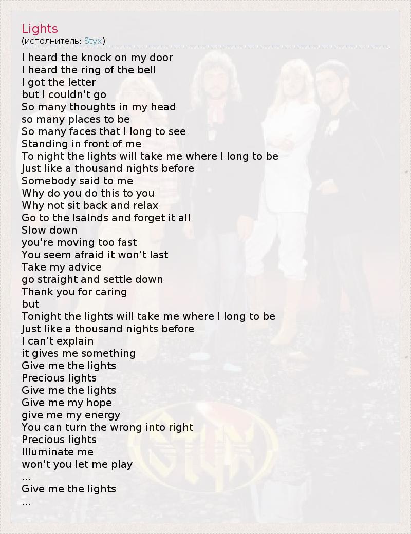 I heard the knock on my door I heard the ring of the bell I got the letter but I couldn't go So many thoughts in my head so many places to be So many faces that I long to see Standing in front of me To night the lights will take me where I long to be Just like a thousand nights before Somebody said to me Why do you do this to you Why not sit back and relax Go to the Isalnds and forget it all Slow down you're moving too fast You seem afraid it won't last Take my advice go straight and settle down Thank you for caring but Tonight the lights will take me where I long to be Just like a thousand nights before I can't explain it gives me something Give me the lights Precious lights Give me the lights Give me my hope give me my energy You can turn the wrong into right Precious lights Illuminate me won't you let me play ... Give me the lights ...