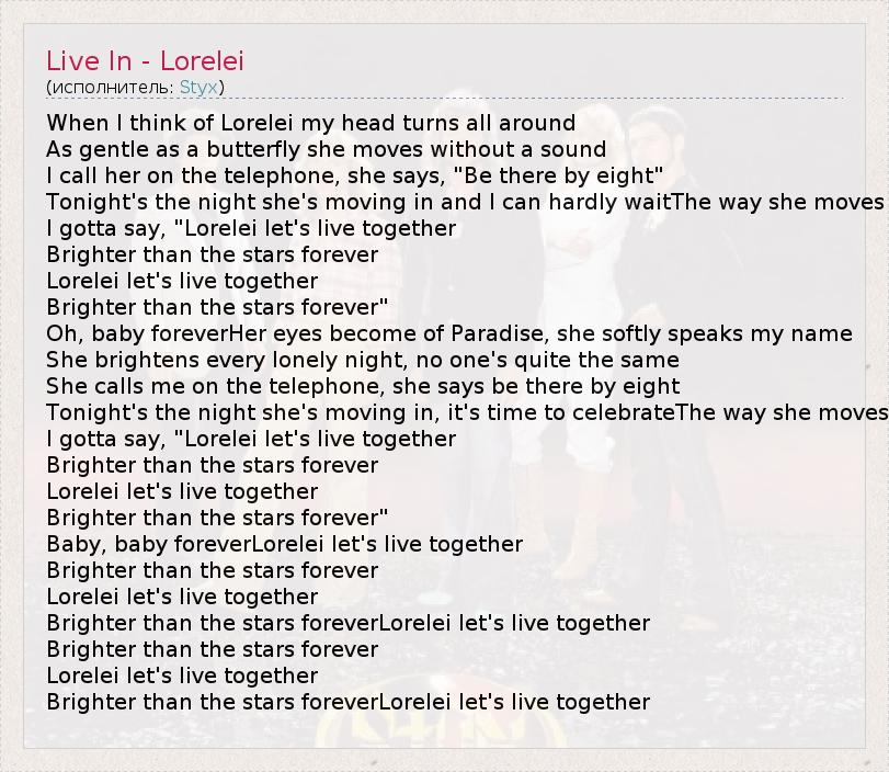 When I think of Lorelei my head turns all around As gentle as a butterfly she moves without a sound I call her on the telephone, she says, "Be there by eight" Tonight's the night she's moving in and I can hardly waitThe way she moves I gotta say, "Lorelei let's live together Brighter than the stars forever Lorelei let's live together Brighter than the stars forever" Oh, baby foreverHer eyes become of Paradise, she softly speaks my name She brightens every lonely night, no one's quite the same She calls me on the telephone, she says be there by eight Tonight's the night she's moving in, it's time to celebrateThe way she moves I gotta say, "Lorelei let's live together Brighter than the stars forever Lorelei let's live together Brighter than the stars forever" Baby, baby foreverLorelei let's live together Brighter than the stars forever Lorelei let's live together Brighter than the stars foreverLorelei let's live together Brighter than the stars forever Lorelei let's live together Brighter than the stars foreverLorelei let's live together