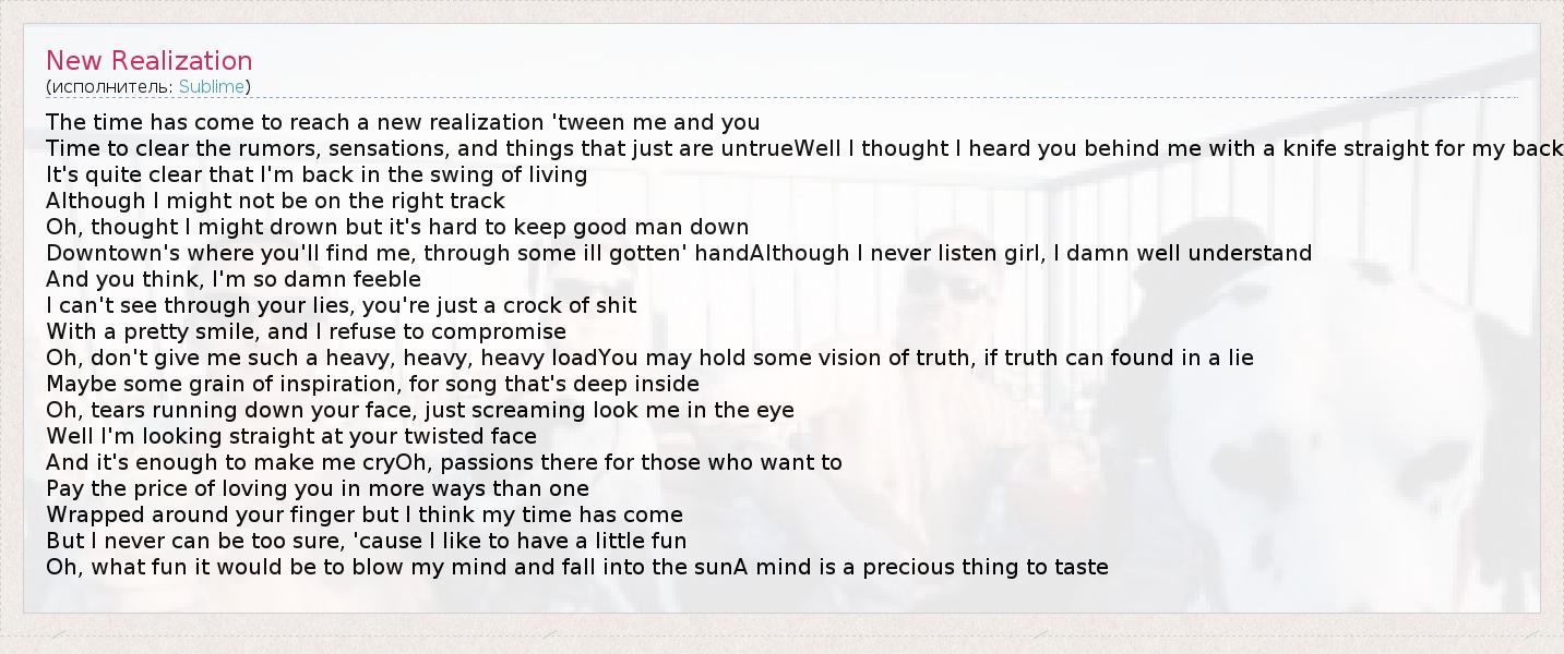Это интересно:Sublime в переводе на русский значит "возвышенный, величественный". Хотя первоначально группа под таким названием ничуть не оправдывала его. Эта банда была, по высказываниям очевидцев, "панками ниже среднего уровня, которых были рады видеть на вечеринках". Однако, начиная с 1988, группа стремительно завоевывала популярность, став музыкальным ЯВЛЕНИЕМ. Смесь dance-hall и rock-steady с агрессивными... продолжение