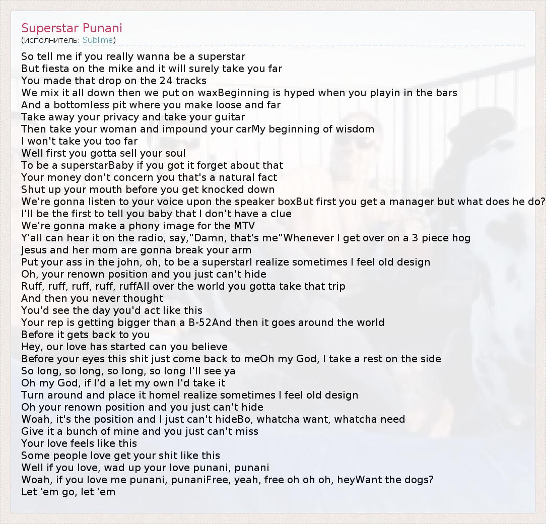 So tell me if you really wanna be a superstar But fiesta on the mike and it will surely take you far You made that drop on the 24 tracks We mix it all down then we put on waxBeginning is hyped when you playin in the bars And a bottomless pit where you make loose and far Take away your privacy and take your guitar Then take your woman and impound your carMy beginning of wisdom I won't take you too far Well first you gotta sell your soul To be a superstarBaby if you got it forget about that Your money don't concern you that's a natural fact Shut up your mouth before you get knocked down We're gonna listen to your voice upon the speaker boxBut first you get a manager but what does he do? I'll be the first to tell you baby that I don't have a clue We're gonna make a phony image for the MTV Y'all can hear it on the radio, say,"Damn, that's me"Whenever I get over on a 3 piece hog Jesus and her mom are gonna break your arm Put your ass in the john, oh, to be a superstarI realize sometimes I feel old design Oh, your renown position and you just can't hide Ruff, ruff, ruff, ruff, ruffAll over the world you gotta take that trip And then you never thought You'd see the day you'd act like this Your rep is getting bigger than a B-52And then it goes around the world Before it gets back to you Hey, our love has started can you believe Before your eyes this shit just come back to meOh my God, I take a rest on the side So long, so long, so long, so long I'll see ya Oh my God, if I'd a let my own I'd take it Turn around and place it homeI realize sometimes I feel old design Oh your renown position and you just can't hide Woah, it's the position and I just can't hideBo, whatcha want, whatcha need Give it a bunch of mine and you just can't miss Your love feels like this Some people love get your shit like this Well if you love, wad up your love punani, punani Woah, if you love me punani, punaniFree, yeah, free oh oh oh, heyWant the dogs? Let 'em go, let 'em