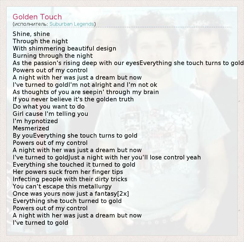 Shine, shine Through the night With shimmering beautiful design Burning through the night As the passion's rising deep with our eyesEverything she touch turns to gold Powers out of my control A night with her was just a dream but now I've turned to goldI'm not alright and I'm not ok As thoughts of you are seepin' through my brain If you never believe it's the golden truth Do what you want to do Girl cause I'm telling you I'm hypnotized Mesmerized By youEverything she touch turns to gold Powers out of my control A night with her was just a dream but now I've turned to goldJust a night with her you'll lose control yeah Everything she touched it turned to gold Her powers suck from her finger tips Infecting people with their dirty tricks You can't escape this metallurgy Once was yours now just a fantasy[2x] Everything she touch turned to gold Powers out of my control A night with her was just a dream but now I've turned to gold