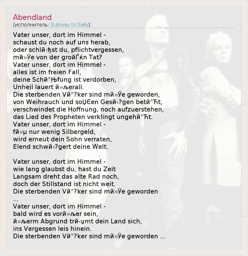 Это интересно:История “Потсдамской семерки” началась в далеком 1990 году, когда музыканты из группы Bodenski Beat, игравшей допотопный рок-н-ролл и не имевшей ни успеха, ни популярности, за одну ночь решили круто изменить ситуацию: найти пару фолк-музыкантов и дать группе новое имя Subway to Sally. В ее составе тогда были Simon и Bodenski (знавшие друг друга с детства и начинавшие свою музыкальную карьеру в школьном бэнде... продолжение