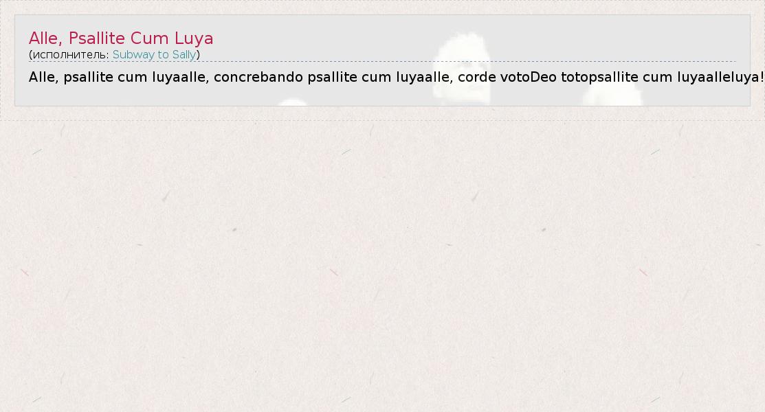 Alle, psallite cum luyaalle, concrebando psallite cum luyaalle, corde votoDeo totopsallite cum luyaalleluya!