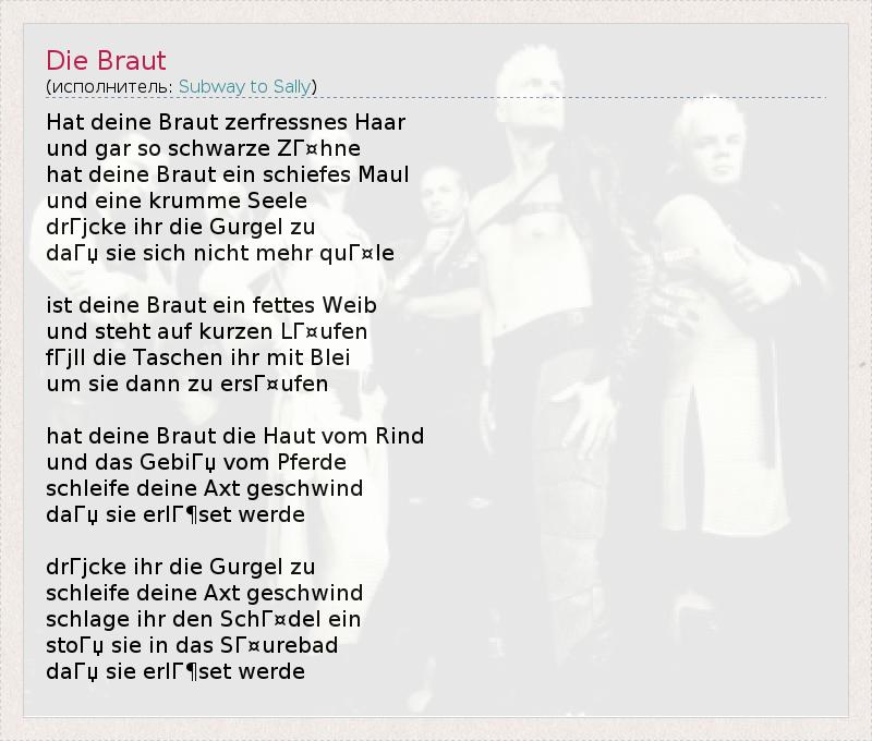 Hat deine Braut zerfressnes Haar und gar so schwarze Zähne hat deine Braut ein schiefes Maul und eine krumme Seele drücke ihr die Gurgel zu daß sie sich nicht mehr quäle ist deine Braut ein fettes Weib und steht auf kurzen Läufen füll die Taschen ihr mit Blei um sie dann zu ersäufen hat deine Braut die Haut vom Rind und das Gebiß vom Pferde schleife deine Axt geschwind daß sie erlöset werde drücke ihr die Gurgel zu schleife deine Axt geschwind schlage ihr den Schädel ein stoß sie in das Säurebad daß sie erlöset werde
