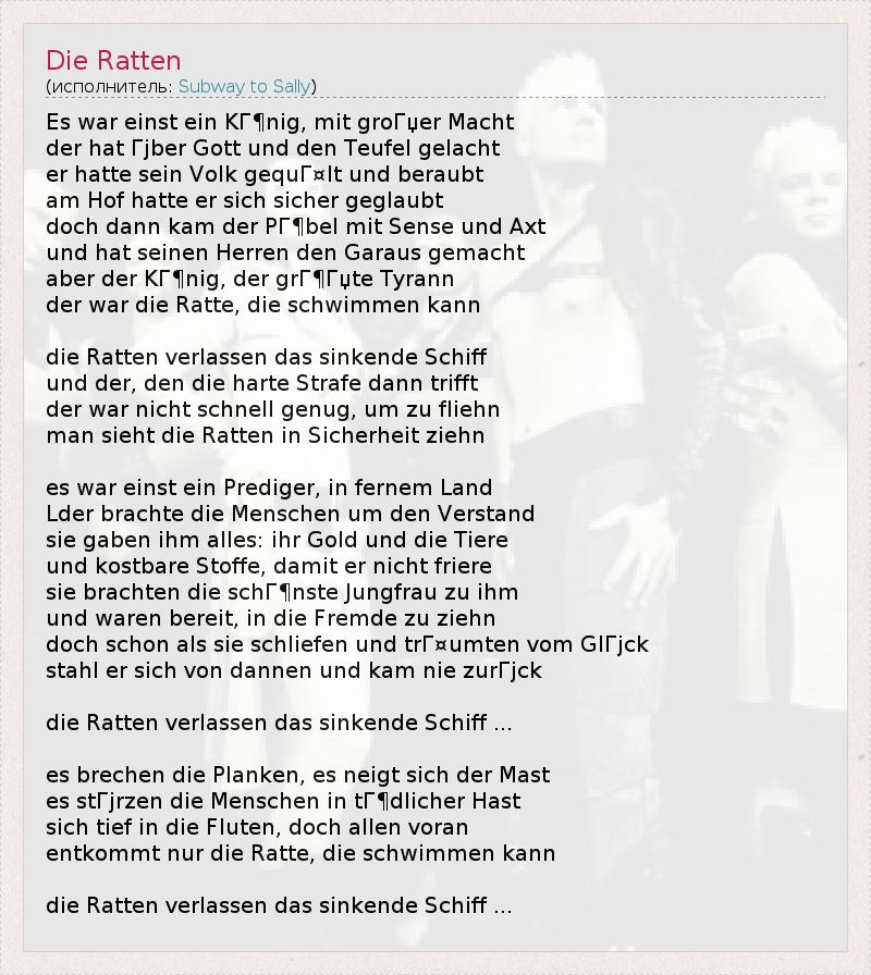 Es war einst ein König, mit großer Macht der hat über Gott und den Teufel gelacht er hatte sein Volk gequält und beraubt am Hof hatte er sich sicher geglaubt doch dann kam der Pöbel mit Sense und Axt und hat seinen Herren den Garaus gemacht aber der König, der größte Tyrann der war die Ratte, die schwimmen kann die Ratten verlassen das sinkende Schiff und der, den die harte Strafe dann trifft der war nicht schnell genug, um zu fliehn man sieht die Ratten in Sicherheit ziehn es war einst ein Prediger, in fernem Land Lder brachte die Menschen um den Verstand sie gaben ihm alles: ihr Gold und die Tiere und kostbare Stoffe, damit er nicht friere sie brachten die schönste Jungfrau zu ihm und waren bereit, in die Fremde zu ziehn doch schon als sie schliefen und träumten vom Glück stahl er sich von dannen und kam nie zurück die Ratten verlassen das sinkende Schiff ... es brechen die Planken, es neigt sich der Mast es stürzen die Menschen in tödlicher Hast sich tief in die Fluten, doch allen voran entkommt nur die Ratte, die schwimmen kann die Ratten verlassen das sinkende Schiff ...