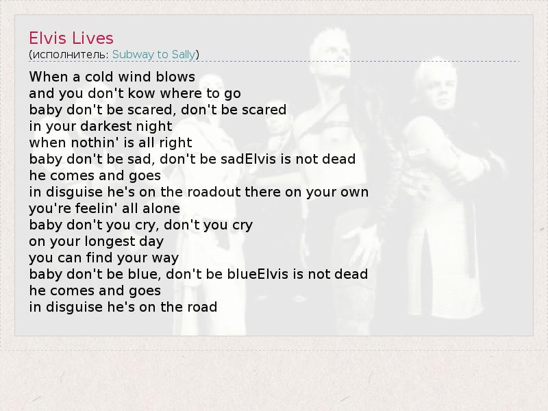 When a cold wind blows and you don't kow where to go baby don't be scared, don't be scared in your darkest night when nothin' is all right baby don't be sad, don't be sadElvis is not dead he comes and goes in disguise he's on the roadout there on your own you're feelin' all alone baby don't you cry, don't you cry on your longest day you can find your way baby don't be blue, don't be blueElvis is not dead he comes and goes in disguise he's on the road
