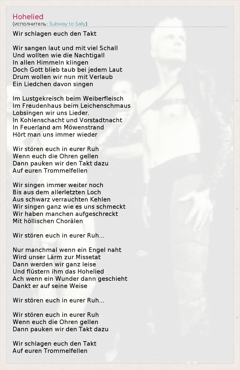 Мы отбиваем для вас ритм. Мы пели громко и звонко, Хотели, как соловей, Звучать до самых небес, Но бог остался глух к каждому звуку. Поэтому сейчас, если позволите, Мы споем об этом песню. При похотливых криках рядом с женским телом, На поминках в доме друзей Мы распеваем песни. В угольной шахте и ночью в пригороде, На огненной земле, на пляже с чайками Снова и снова раздается наше пение. Мы нарушаем ваш покой, Когда звеним у вас в ушах, Мы отбиваем ритм На ваших барабанных перепонках. Мы всё продолжаем петь Даже из самой последней дыры, Из дочерна прокуренных глоток. Мы поем как нам нравится, Мы многих напугали Своими адскими хоралами. Мы нарушаем ваш покой... Лишь когда приблизится ангел, Наш шум станет преступлением, И тогда мы очень тихо Нашепчем ему песнь песней. Ах, если затем случится чудо, Он отблагодарит нас по-своему. Мы нарушаем ваш покой... Мы нарушаем ваш покой, Когда звеним у вас в ушах, Мы отбиваем ритм. Мы отбиваем для вас ритм На ваших барабанных перепонках.