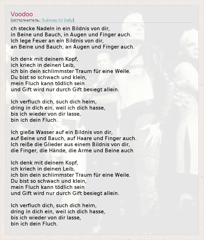 ch stecke Nadeln in ein Bildnis von dir, in Beine und Bauch, in Augen und Finger auch. Ich lege Feuer an ein Bildnis von dir, an Beine und Bauch, an Augen und Finger auch. Ich denk mit deinem Kopf, ich kriech in deinen Leib, ich bin dein schlimmster Traum für eine Weile. Du bist so schwach und klein, mein Fluch kann tödlich sein und Gift wird nur durch Gift besiegt allein. Ich verfluch dich, such dich heim, dring in dich ein, weil ich dich hasse, bis ich wieder von dir lasse, bin ich dein Fluch. Ich gieße Wasser auf ein Bildnis von dir, auf Beine und Bauch, auf Haare und Finger auch. Ich reiße die Glieder aus einem Bildnis von dir, die Finger, die Hände, die Arme und Beine auch Ich denk mit deinem Kopf, ich kriech in deinen Leib, ich bin dein schlimmster Traum für eine Weile. Du bist so schwach und klein, mein Fluch kann tödlich sein und Gift wird nur durch Gift besiegt allein. Ich verfluch dich, such dich heim, dring in dich ein, weil ich dich hasse, bis ich wieder von dir lasse, bin ich dein Fluch.
