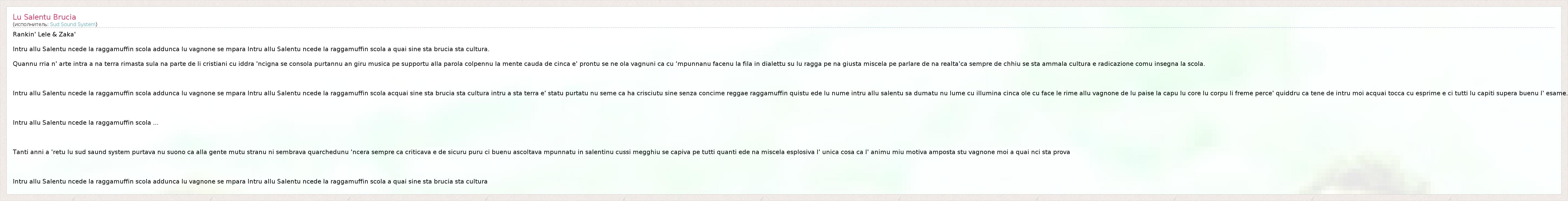 Tanti anni a 'retu lu sud saund system purtava nu suono ca alla gente mutu stranu ni sembrava quarchedunu 'ncera sempre ca criticava e de sicuru puru ci buenu ascoltava mpunnatu in salentinu cussi megghiu se capiva pe tutti quanti ede na miscela esplosiva l' unica cosa ca l' animu miu motiva amposta stu vagnone moi a quai nci sta prova