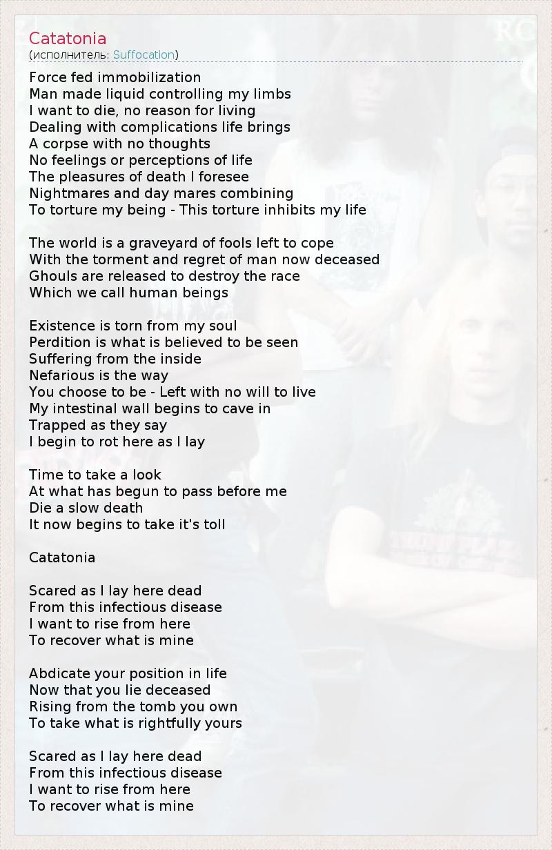 Force fed immobilization Man made liquid controlling my limbs I want to die, no reason for living Dealing with complications life brings A corpse with no thoughts No feelings or perceptions of life The pleasures of death I foresee Nightmares and day mares combining To torture my being - This torture inhibits my life The world is a graveyard of fools left to cope With the torment and regret of man now deceased Ghouls are released to destroy the race Which we call human beings Existence is torn from my soul Perdition is what is believed to be seen Suffering from the inside Nefarious is the way You choose to be - Left with no will to live My intestinal wall begins to cave in Trapped as they say I begin to rot here as I lay Time to take a look At what has begun to pass before me Die a slow death It now begins to take it's toll Catatonia Scared as I lay here dead From this infectious disease I want to rise from here To recover what is mine Abdicate your position in life Now that you lie deceased Rising from the tomb you own To take what is rightfully yours Scared as I lay here dead From this infectious disease I want to rise from here To recover what is mine