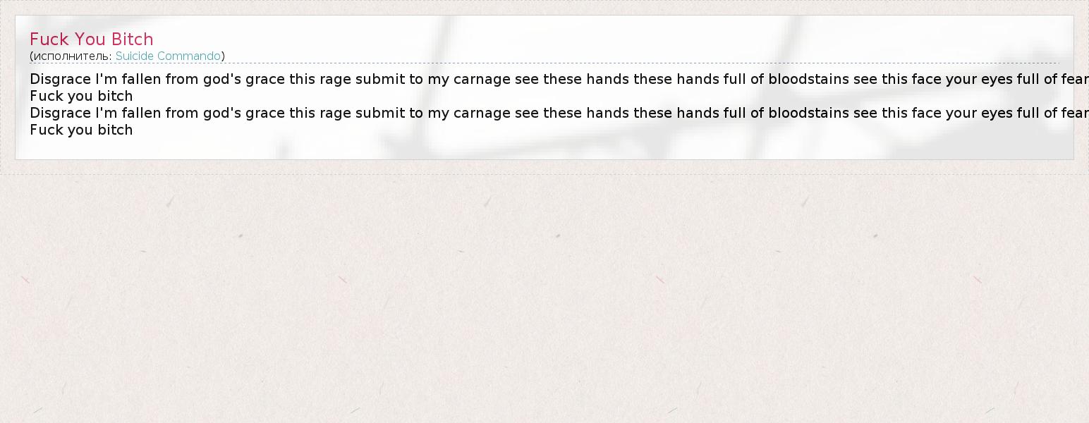 Disgrace I'm fallen from god's grace this rage submit to my carnage see these hands these hands full of bloodstains see this face your eyes full of fear Fuck you bitch Disgrace I'm fallen from god's grace this rage submit to my carnage see these hands these hands full of bloodstains see this face your eyes full of fear Fuck you bitch