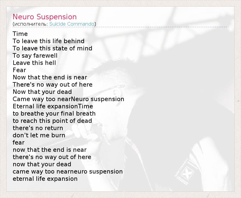 Time To leave this life behind To leave this state of mind To say farewell Leave this hell Fear Now that the end is near There's no way out of here Now that your dead Came way too nearNeuro suspension Eternal life expansionTime to breathe your final breath to reach this point of dead there's no return don't let me burn fear now that the end is near there's no way out of here now that your dead came way too nearneuro suspension eternal life expansion