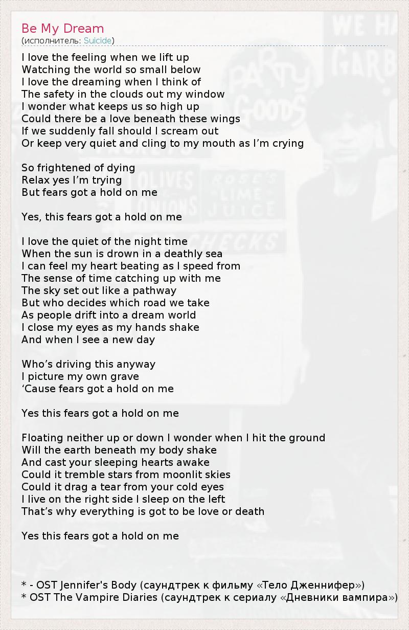 I love the feeling when we lift up Watching the world so small below I love the dreaming when I think of The safety in the clouds out my window I wonder what keeps us so high up Could there be a love beneath these wings If we suddenly fall should I scream out Or keep very quiet and cling to my mouth as I’m crying So frightened of dying Relax yes I’m trying But fears got a hold on me Yes, this fears got a hold on me I love the quiet of the night time When the sun is drown in a deathly sea I can feel my heart beating as I speed from The sense of time catching up with me The sky set out like a pathway But who decides which road we take As people drift into a dream world I close my eyes as my hands shake And when I see a new day Who’s driving this anyway I picture my own grave ‘Cause fears got a hold on me Yes this fears got a hold on me Floating neither up or down I wonder when I hit the ground Will the earth beneath my body shake And cast your sleeping hearts awake Could it tremble stars from moonlit skies Could it drag a tear from your cold eyes I live on the right side I sleep on the left That’s why everything is got to be love or death Yes this fears got a hold on me * - OST Jennifer's Body (саундтрек к фильму «Тело Дженнифер») * OST The Vampire Diaries (саундтрек к сериалу «Дневники вампира»)