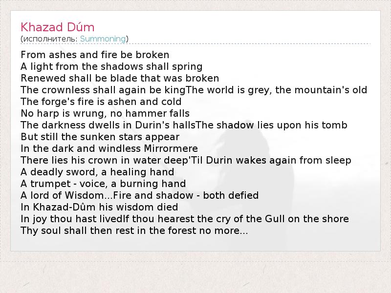 From ashes and fire be broken A light from the shadows shall spring Renewed shall be blade that was broken The crownless shall again be kingThe world is grey, the mountain's old The forge's fire is ashen and cold No harp is wrung, no hammer falls The darkness dwells in Durin's hallsThe shadow lies upon his tomb But still the sunken stars appear In the dark and windless Mirrormere There lies his crown in water deep'Til Durin wakes again from sleep A deadly sword, a healing hand A trumpet - voice, a burning hand A lord of Wisdom...Fire and shadow - both defied In Khazad-Dûm his wisdom died In joy thou hast livedIf thou hearest the cry of the Gull on the shore Thy soul shall then rest in the forest no more...