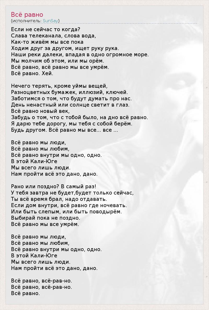 Если не сейчас то когда? Слава телеканала, слова вода, Как-то живём мы все пока Ходим друг за другом, ищет руку рука. Наши реки далеки, впадая в одно огромное море. Мы молчим об этом, или мы орём. Всё равно, всё равно мы все умрём. Всё равно. Хей. Нечего терять, кроме уймы вещей, Разноцветных бумажек, иллюзий, ключей. Заботимся о том, что будут думать про нас. День ненастный или солнце светит в глаз. Всё равно новый век, Забудь о том, что с тобой было, на дно всё равно. Я дарю тебе дорогу, мы тебя с собой берём. Будь другом. Всё равно мы все... все ... Всё равно мы люди, Всё равно мы любим, Всё равно внутри мы одно, одно. В этой Кали-Юге Мы всего лишь люди. Нам пройти всё это дано, дано. Рано или поздно? В самый раз! У тебя завтра не будет,будет только сейчас, Ты всё время брал, надо отдавать. Если дом внутри, всё равно где ночевать. Или быть слепым, или быть поводырём. Выбирай пока не поздно. Всё равно мы все умрём. Всё равно мы люди, Всё равно мы любим, Всё равно внутри мы одно, одно. В этой Кали-Юге Мы всего лишь люди. Нам пройти всё это дано, дано. Всё равно, всё-рав-но. Всё равно, всё-рав-но. Всё равно.
