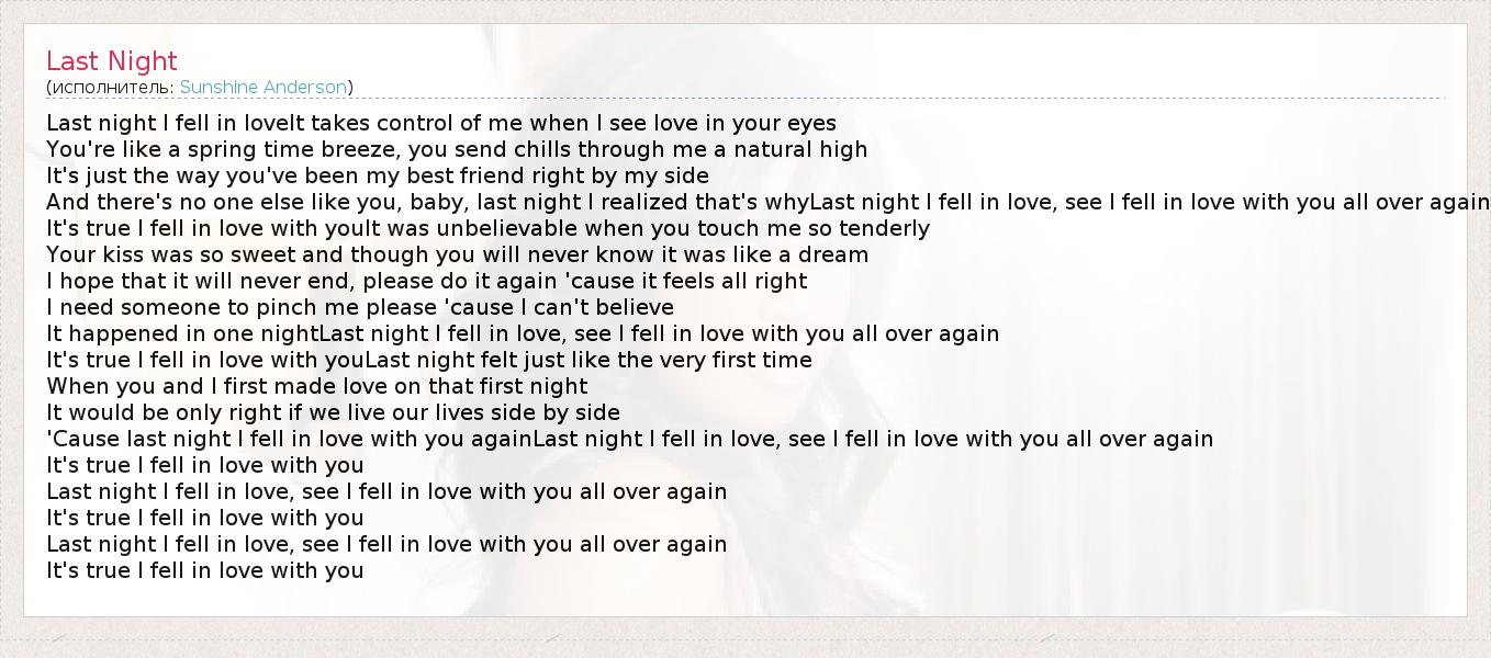'Cause last night I fell in love with you againLast night I fell in love, see I fell in love with you all over again