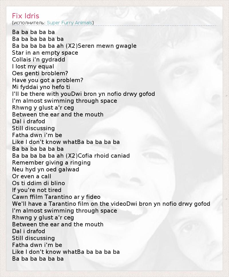 Ba ba ba ba ba Ba ba ba ba ba ba Ba ba ba ba ba ah (X2)Seren mewn gwagle Star in an empty space Collais i'n gydradd I lost my equal Oes genti broblem? Have you got a problem? Mi fyddai yno hefo ti I'll be there with youDwi bron yn nofio drwy gofod I'm almost swimming through space Rhwng y glust a'r ceg Between the ear and the mouth Dal i drafod Still discussing Fatha dwn i'm be Like I don't know whatBa ba ba ba ba Ba ba ba ba ba ba Ba ba ba ba ba ah (X2)Cofia rhoid caniad Remember giving a ringing Neu hyd yn oed galwad Or even a call Os ti ddim di blino If you're not tired Cawn ffilm Tarantino ar y fideo We'll have a Tarantino film on the videoDwi bron yn nofio drwy gofod I'm almost swimming through space Rhwng y glust a'r ceg Between the ear and the mouth Dal i drafod Still discussing Fatha dwn i'm be Like I don't know whatBa ba ba ba ba Ba ba ba ba ba ba