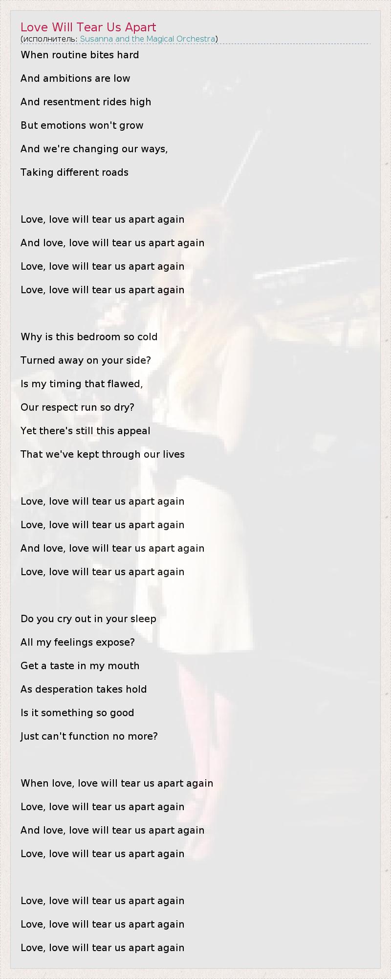 When routine bites hard And ambitions are low And resentment rides high But emotions won't grow And we're changing our ways, Taking different roads Love, love will tear us apart again And love, love will tear us apart again Love, love will tear us apart again Love, love will tear us apart again Why is this bedroom so cold Turned away on your side? Is my timing that flawed, Our respect run so dry? Yet there's still this appeal That we've kept through our lives Love, love will tear us apart again Love, love will tear us apart again And love, love will tear us apart again Love, love will tear us apart again Do you cry out in your sleep All my feelings expose? Get a taste in my mouth As desperation takes hold Is it something so good Just can't function no more? When love, love will tear us apart again Love, love will tear us apart again And love, love will tear us apart again Love, love will tear us apart again Love, love will tear us apart again Love, love will tear us apart again Love, love will tear us apart again