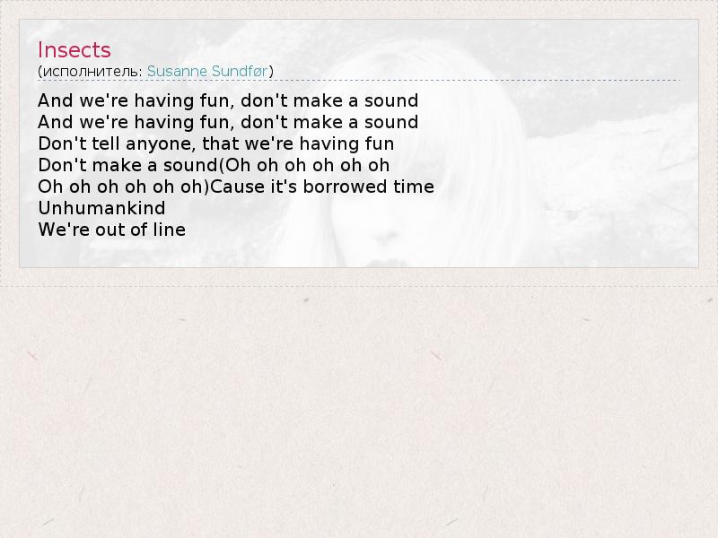 And we're having fun, don't make a sound And we're having fun, don't make a sound Don't tell anyone, that we're having fun Don't make a sound(Oh oh oh oh oh oh Oh oh oh oh oh oh)Cause it's borrowed time Unhumankind We're out of line