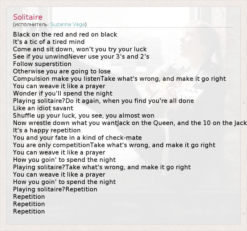 Black on the red and red on black It's a tic of a tired mind Come and sit down, won't you try your luck See if you unwindNever use your 3's and 2's Follow superstition Otherwise you are going to lose Compulsion make you listenTake what's wrong, and make it go right You can weave it like a prayer Wonder if you'll spend the night Playing solitaire?Do it again, when you find you're all done Like an idiot savant Shuffle up your luck, you see, you almost won Now wrestle down what you wantJack on the Queen, and the 10 on the Jack It's a happy repetition You and your fate in a kind of check-mate You are only competitionTake what's wrong, and make it go right You can weave it like a prayer How you goin' to spend the night Playing solitaire?Take what's wrong, and make it go right You can weave it like a prayer How you goin' to spend the night Playing solitaire?Repetition Repetition Repetition Repetition