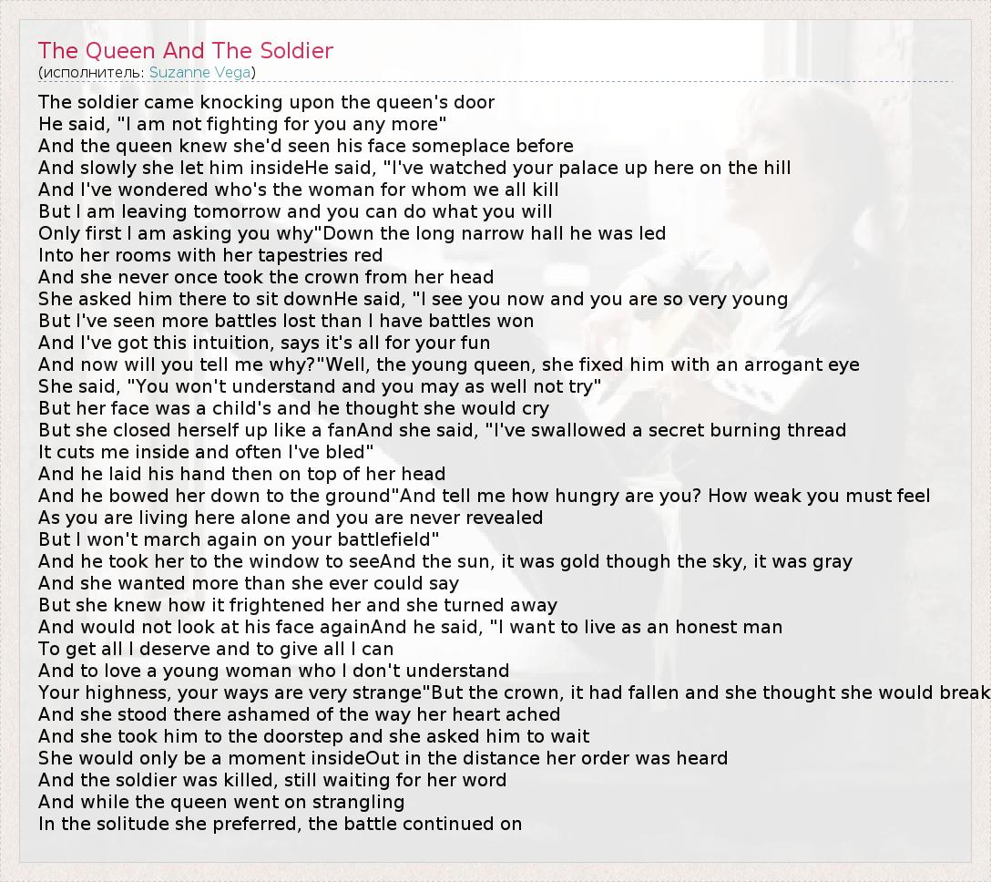 А как ты думаешь, о чем песня "The Queen And The Soldier" ?
