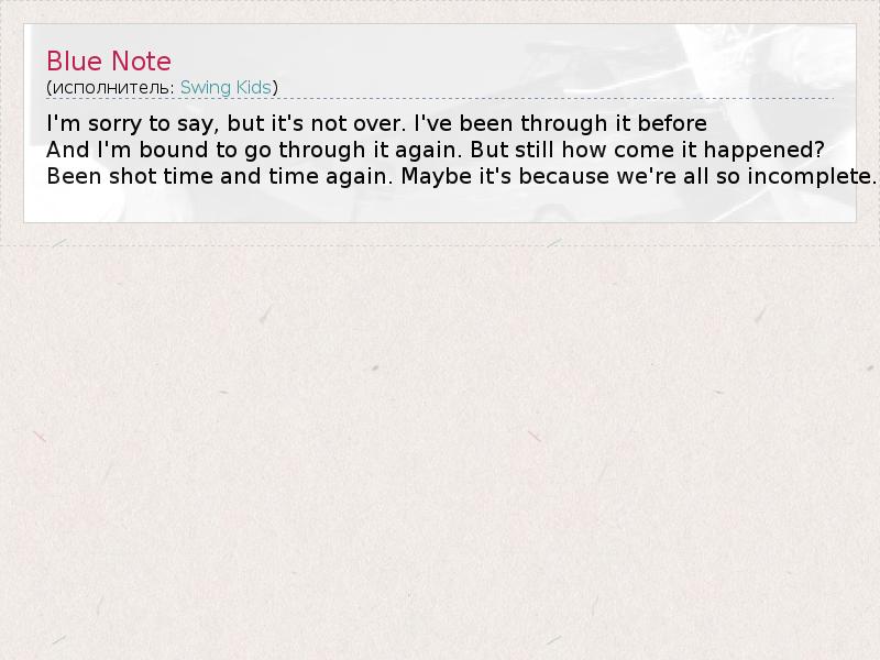 I'm sorry to say, but it's not over. I've been through it before And I'm bound to go through it again. But still how come it happened? Been shot time and time again. Maybe it's because we're all so incomplete.