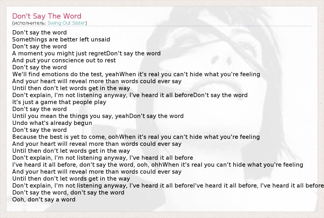 Don't say the word Somethings are better left unsaid Don't say the word A moment you might just regretDon't say the word And put your conscience out to rest Don't say the word We'll find emotions do the test, yeahWhen it's real you can't hide what you're feeling And your heart will reveal more than words could ever say Until then don't let words get in the way Don't explain, I'm not listening anyway, I've heard it all beforeDon't say the word It's just a game that people play Don't say the word Until you mean the things you say, yeahDon't say the word Undo what's already begun Don't say the word Because the best is yet to come, oohWhen it's real you can't hide what you're feeling And your heart will reveal more than words could ever say Until then don't let words get in the way Don't explain, I'm not listening anyway, I've heard it all before I've heard it all before, don't say the word, ooh, ohhWhen it's real you can't hide what you're feeling And your heart will reveal more than words could ever say Until then don't let words get in the way Don't explain, I'm not listening anyway, I've heard it all beforeI've heard it all before, I've heard it all before Don't say the word, don't say the word Ooh, don't say a word