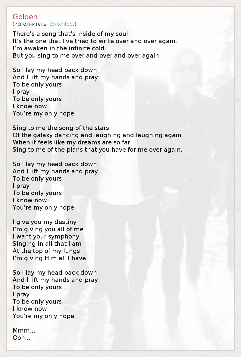 В самой глубине моей души живёт песня, Та, что я пытался написать снова и снова. Я проснулся в страшном холоде, Но ты поёшь мне снова и снова... Я наклоняю назад голову, Воздеваю к небу руки и молюсь, Чтобы быть только твоим, Молюсь, Чтобы быть только твоим, Теперь я знаю, Что ты - моя единственная надежда. Спой мне песню о звёздах И о галактике, танцующей и смеющейся, Когда кажется, что мои мечты так далеки, Спой мне о планах, которые ты уготовил для меня. Я наклоняю назад голову, Воздеваю к небу руки и молюсь, Чтобы быть только твоим, Молюсь, Чтобы быть только твоим, Теперь я знаю, Что ты - моя единственная надежда. Я доверяю тебе мою судьбу, Отдаю тебе всего себя, Я хочу, чтобы твоя симфония Пела в каждой моей клетке, Во весь мой голос, Я отдаю Ему всё, что имею И я наклоняю назад голову, Воздеваю к небу руки и молюсь, Чтобы быть только твоим, Молюсь, Чтобы быть только твоим, Теперь я знаю, Что ты - моя единственная надежда. Ммм... Ооо...