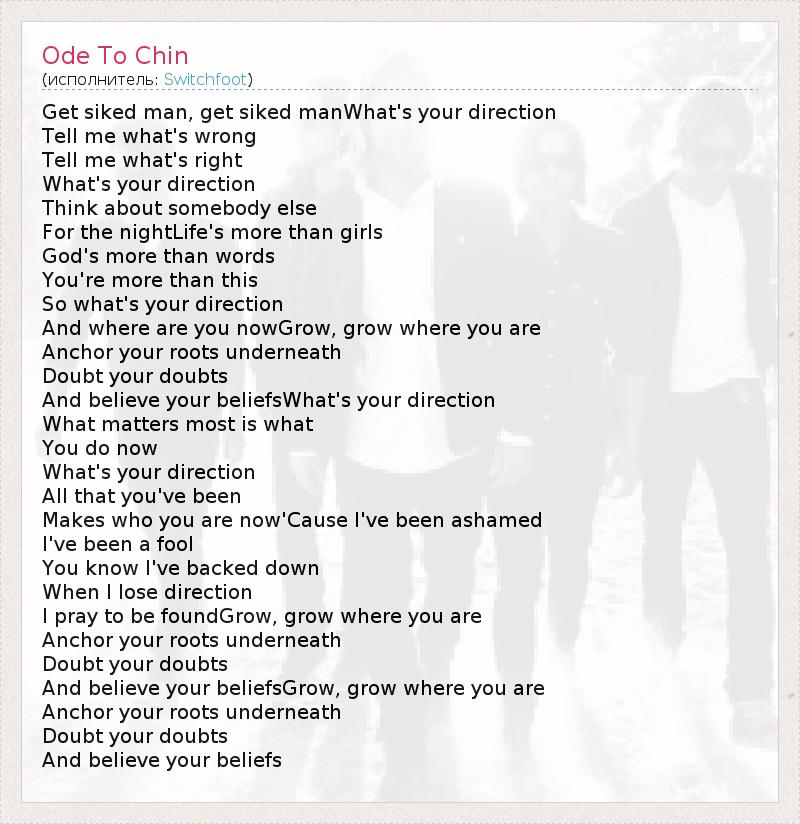 Get siked man, get siked manWhat's your direction Tell me what's wrong Tell me what's right What's your direction Think about somebody else For the nightLife's more than girls God's more than words You're more than this So what's your direction And where are you nowGrow, grow where you are Anchor your roots underneath Doubt your doubts And believe your beliefsWhat's your direction What matters most is what You do now What's your direction All that you've been Makes who you are now'Cause I've been ashamed I've been a fool You know I've backed down When I lose direction I pray to be foundGrow, grow where you are Anchor your roots underneath Doubt your doubts And believe your beliefsGrow, grow where you are Anchor your roots underneath Doubt your doubts And believe your beliefs