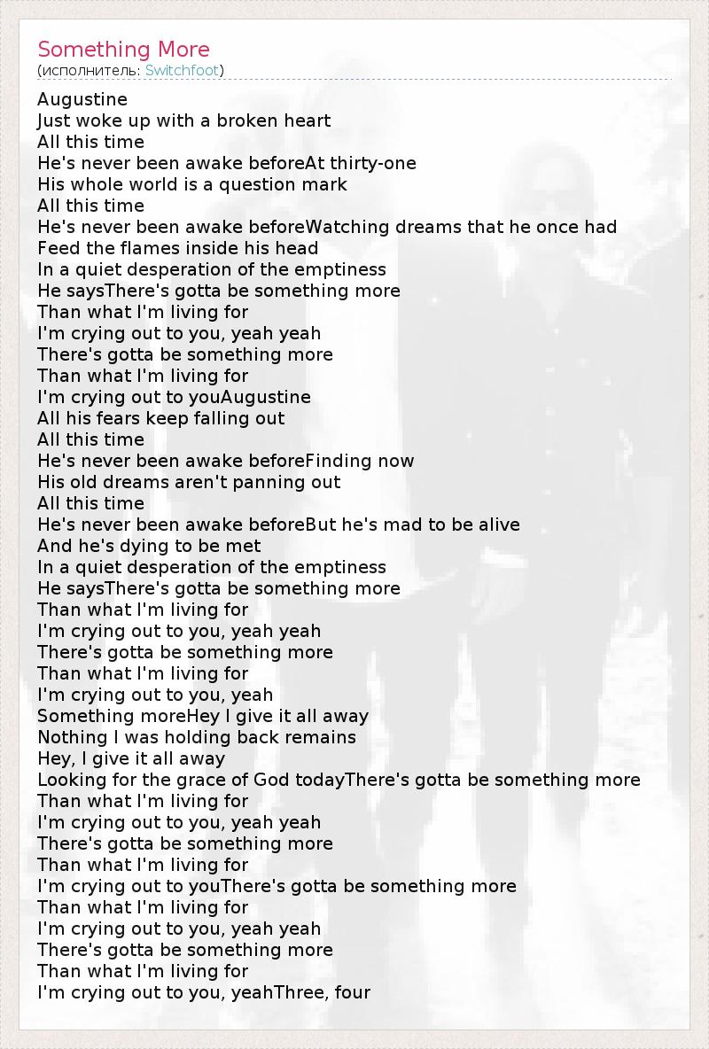 Augustine Just woke up with a broken heart All this time He's never been awake beforeAt thirty-one His whole world is a question mark All this time He's never been awake beforeWatching dreams that he once had Feed the flames inside his head In a quiet desperation of the emptiness He saysThere's gotta be something more Than what I'm living for I'm crying out to you, yeah yeah There's gotta be something more Than what I'm living for I'm crying out to youAugustine All his fears keep falling out All this time He's never been awake beforeFinding now His old dreams aren't panning out All this time He's never been awake beforeBut he's mad to be alive And he's dying to be met In a quiet desperation of the emptiness He saysThere's gotta be something more Than what I'm living for I'm crying out to you, yeah yeah There's gotta be something more Than what I'm living for I'm crying out to you, yeah Something moreHey I give it all away Nothing I was holding back remains Hey, I give it all away Looking for the grace of God todayThere's gotta be something more Than what I'm living for I'm crying out to you, yeah yeah There's gotta be something more Than what I'm living for I'm crying out to youThere's gotta be something more Than what I'm living for I'm crying out to you, yeah yeah There's gotta be something more Than what I'm living for I'm crying out to you, yeahThree, four