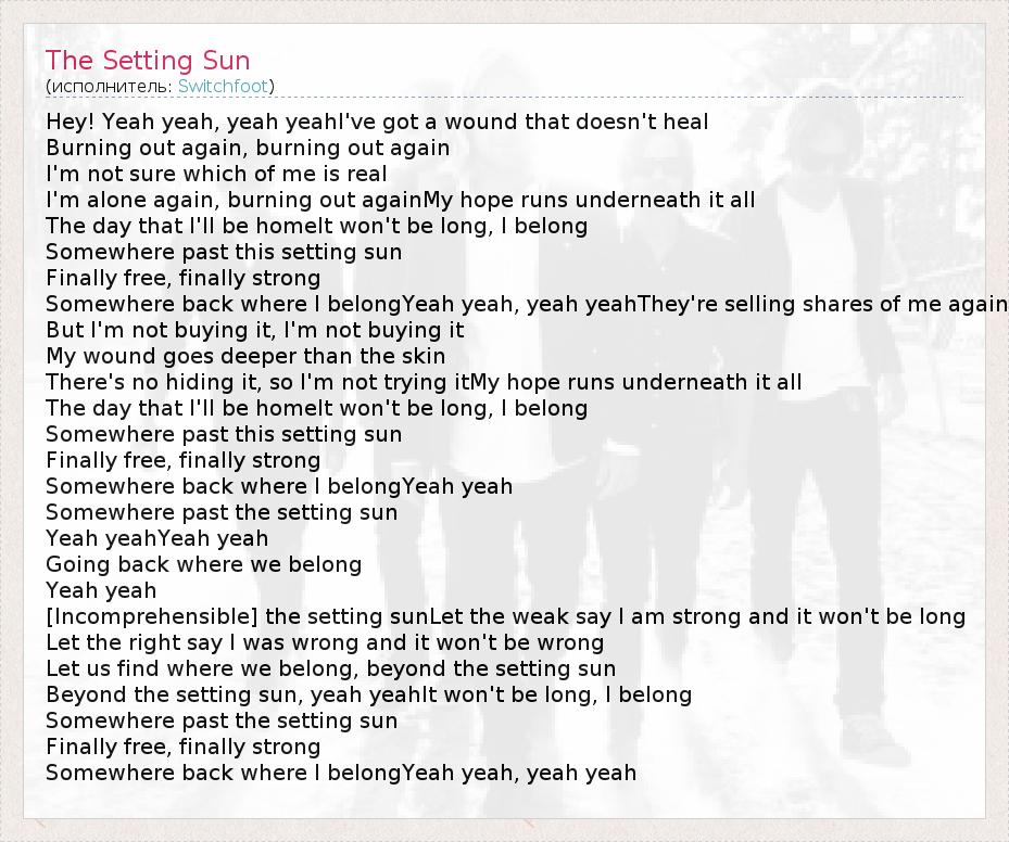 Hey! Yeah yeah, yeah yeahI've got a wound that doesn't heal Burning out again, burning out again I'm not sure which of me is real I'm alone again, burning out againMy hope runs underneath it all The day that I'll be homeIt won't be long, I belong Somewhere past this setting sun Finally free, finally strong Somewhere back where I belongYeah yeah, yeah yeahThey're selling shares of me again But I'm not buying it, I'm not buying it My wound goes deeper than the skin There's no hiding it, so I'm not trying itMy hope runs underneath it all The day that I'll be homeIt won't be long, I belong Somewhere past this setting sun Finally free, finally strong Somewhere back where I belongYeah yeah Somewhere past the setting sun Yeah yeahYeah yeah Going back where we belong Yeah yeah [Incomprehensible] the setting sunLet the weak say I am strong and it won't be long Let the right say I was wrong and it won't be wrong Let us find where we belong, beyond the setting sun Beyond the setting sun, yeah yeahIt won't be long, I belong Somewhere past the setting sun Finally free, finally strong Somewhere back where I belongYeah yeah, yeah yeah