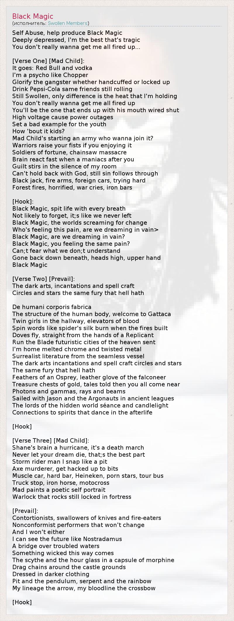 Это интересно:Swollen Members (Своллэн Мэмберс) - канадская хип-хоп группа из города Ванкувер, Британская Колумбия, состоящая в основном из дуэта Madchild и Prevail. Часто, в состав группы включают вокалиста Moka Only (который был фактически членом группы в течение короткого периода времени в 90-х годах, а затем в 2002-2005 годах) и продюсера Rob The Viking,... продолжение