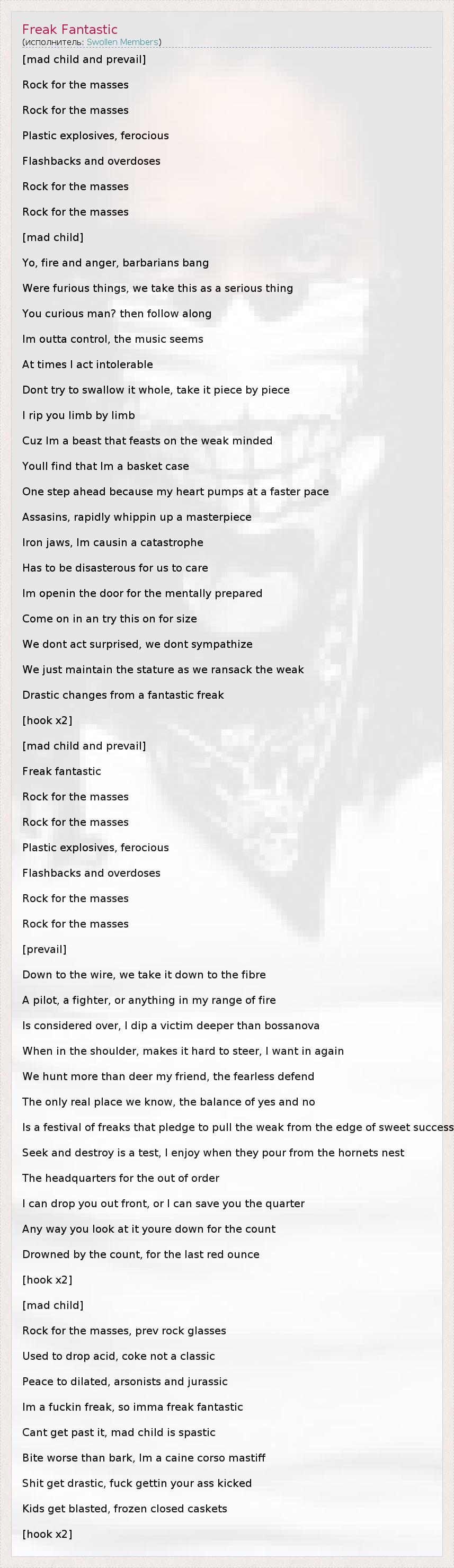 Это интересно:Swollen Members (Своллэн Мэмберс) - канадская хип-хоп группа из города Ванкувер, Британская Колумбия, состоящая в основном из дуэта Madchild и Prevail. Часто, в состав группы включают вокалиста Moka Only (который был фактически членом группы в течение короткого периода времени в 90-х годах, а затем в 2002-2005 годах) и продюсера Rob The Viking,... продолжение