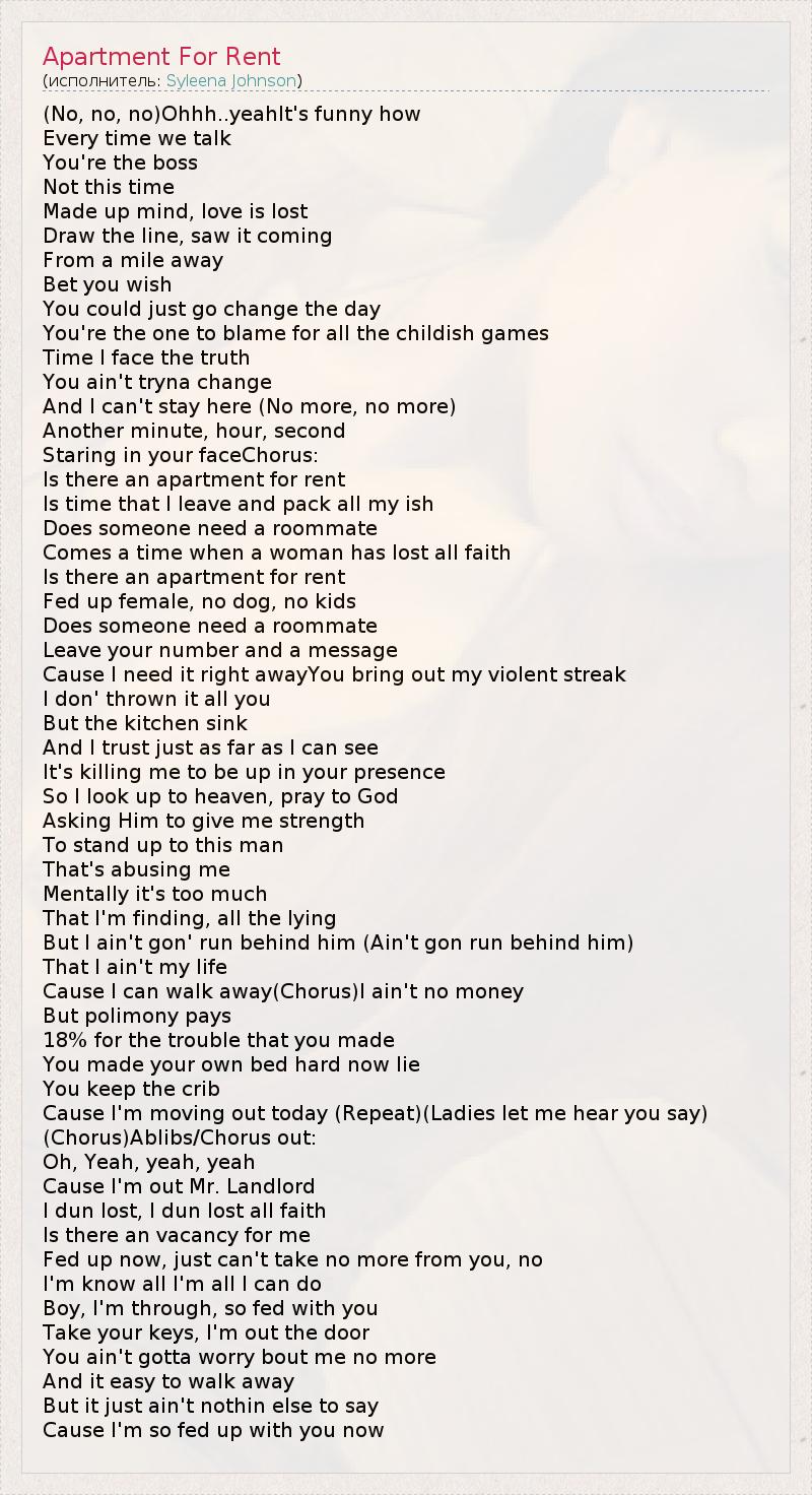 (No, no, no)Ohhh..yeahIt's funny how Every time we talk You're the boss Not this time Made up mind, love is lost Draw the line, saw it coming From a mile away Bet you wish You could just go change the day You're the one to blame for all the childish games Time I face the truth You ain't tryna change And I can't stay here (No more, no more) Another minute, hour, second Staring in your faceChorus: Is there an apartment for rent Is time that I leave and pack all my ish Does someone need a roommate Comes a time when a woman has lost all faith Is there an apartment for rent Fed up female, no dog, no kids Does someone need a roommate Leave your number and a message Cause I need it right awayYou bring out my violent streak I don' thrown it all you But the kitchen sink And I trust just as far as I can see It's killing me to be up in your presence So I look up to heaven, pray to God Asking Him to give me strength To stand up to this man That's abusing me Mentally it's too much That I'm finding, all the lying But I ain't gon' run behind him (Ain't gon run behind him) That I ain't my life Cause I can walk away(Chorus)I ain't no money But polimony pays 18% for the trouble that you made You made your own bed hard now lie You keep the crib Cause I'm moving out today (Repeat)(Ladies let me hear you say) (Chorus)Ablibs/Chorus out: Oh, Yeah, yeah, yeah Cause I'm out Mr. Landlord I dun lost, I dun lost all faith Is there an vacancy for me Fed up now, just can't take no more from you, no I'm know all I'm all I can do Boy, I'm through, so fed with you Take your keys, I'm out the door You ain't gotta worry bout me no more And it easy to walk away But it just ain't nothin else to say Cause I'm so fed up with you now