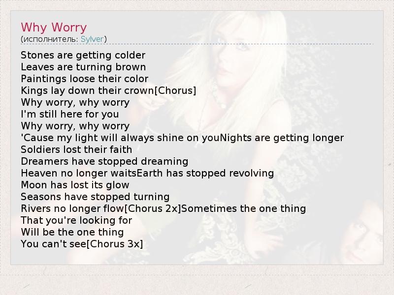 Stones are getting colder Leaves are turning brown Paintings loose their color Kings lay down their crown[Chorus] Why worry, why worry I'm still here for you Why worry, why worry 'Cause my light will always shine on youNights are getting longer Soldiers lost their faith Dreamers have stopped dreaming Heaven no longer waitsEarth has stopped revolving Moon has lost its glow Seasons have stopped turning Rivers no longer flow[Chorus 2x]Sometimes the one thing That you're looking for Will be the one thing You can't see[Chorus 3x]