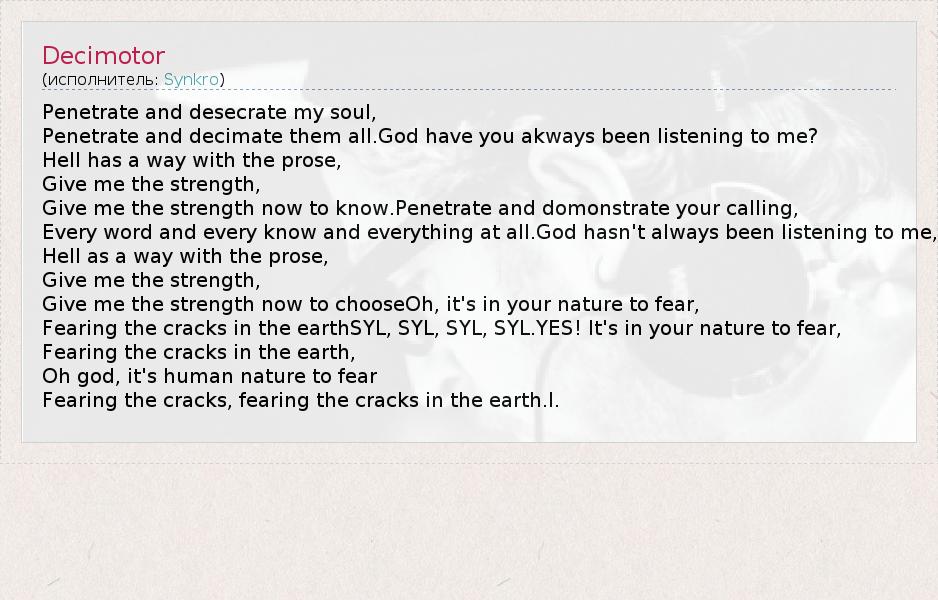Fearing the cracks in the earthSYL, SYL, SYL, SYL.YES! It's in your nature to fear,