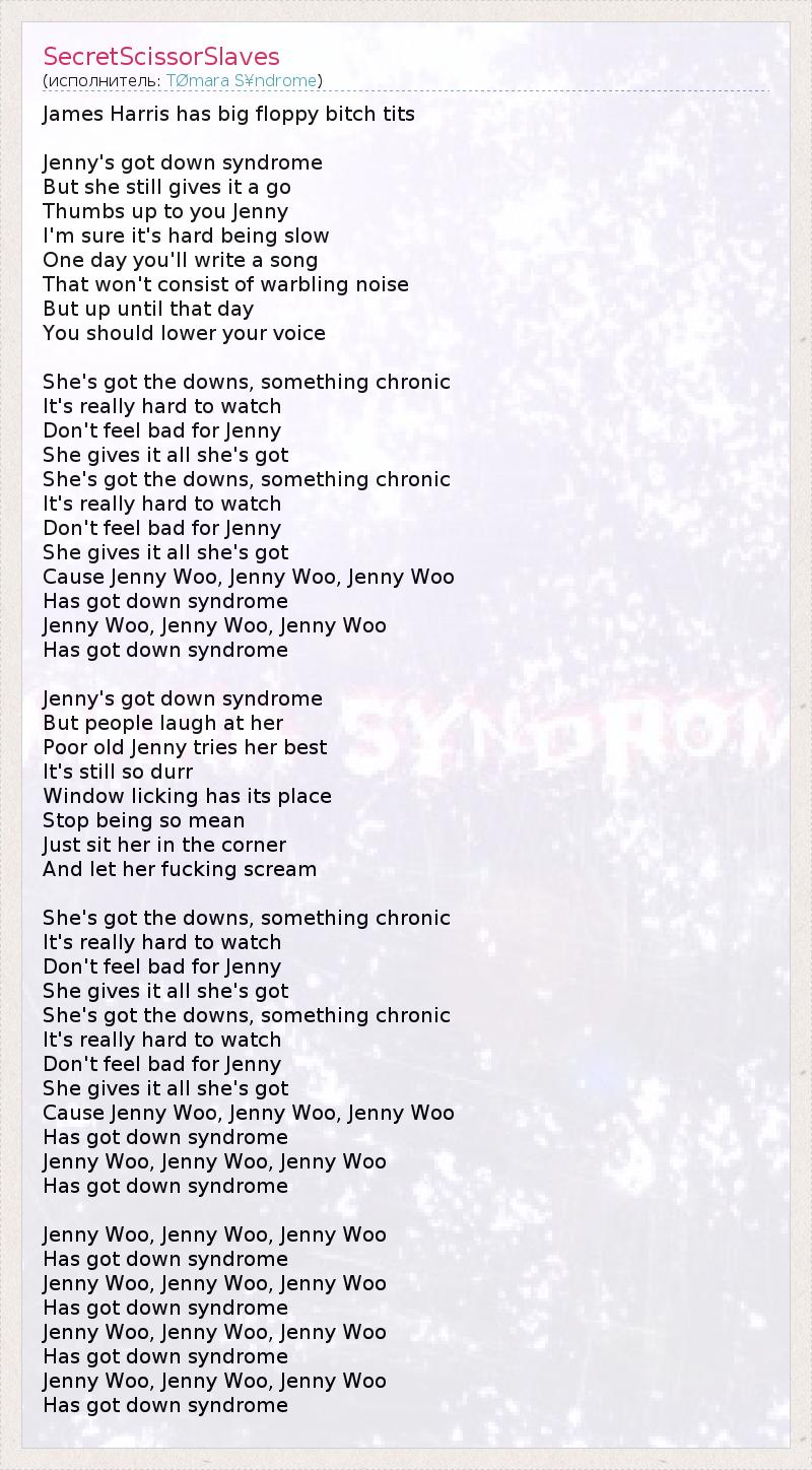 У Джеймса Харриса большие сучьи обвислые сиськи Дженни, хоть и даун, Но туда же: хочет петь, Большой палец, Дженни, Тупою жить – это жесть, Напишешь песню ты Без верещанья, может быть, Но только до тех пор Голосок приглуши Она же даун, типа хроник, Смотреть жаль на неё, Не ругайте Дженни, Как может, так поёт, Она же даун, типа хроник, Смотреть жаль на неё, Не ругайте Дженни, Как может, так поёт, Ведь Дженни Ву, Дженни Ву, Дженни Ву, Она же даун, Дженни Ву, Дженни Ву, Дженни Ву, Она же даун Дженни, хоть и даун, Но вызывает смех, Не жалеет сил своих, В итоге: буээээ... Слабоумным место есть, Злым нет смысла быть, Сидит пусть в уголочке И на*уй там вопит Она же даун, типа хроник, Смотреть жаль на неё, Не ругайте Дженни, Как может, так поёт, Она же даун, типа хроник, Смотреть жаль на неё, Не ругайте Дженни, Как может, так поёт, Ведь Дженни Ву, Дженни Ву, Дженни Ву, Она же даун, Дженни Ву, Дженни Ву, Дженни Ву, Она же даун Дженни Ву, Дженни Ву, Дженни Ву, Она же даун, Дженни Ву, Дженни Ву, Дженни Ву, Она же даун, Дженни Ву, Дженни Ву, Дженни Ву, Она же даун, Дженни Ву, Дженни Ву, Дженни Ву, Она же даун