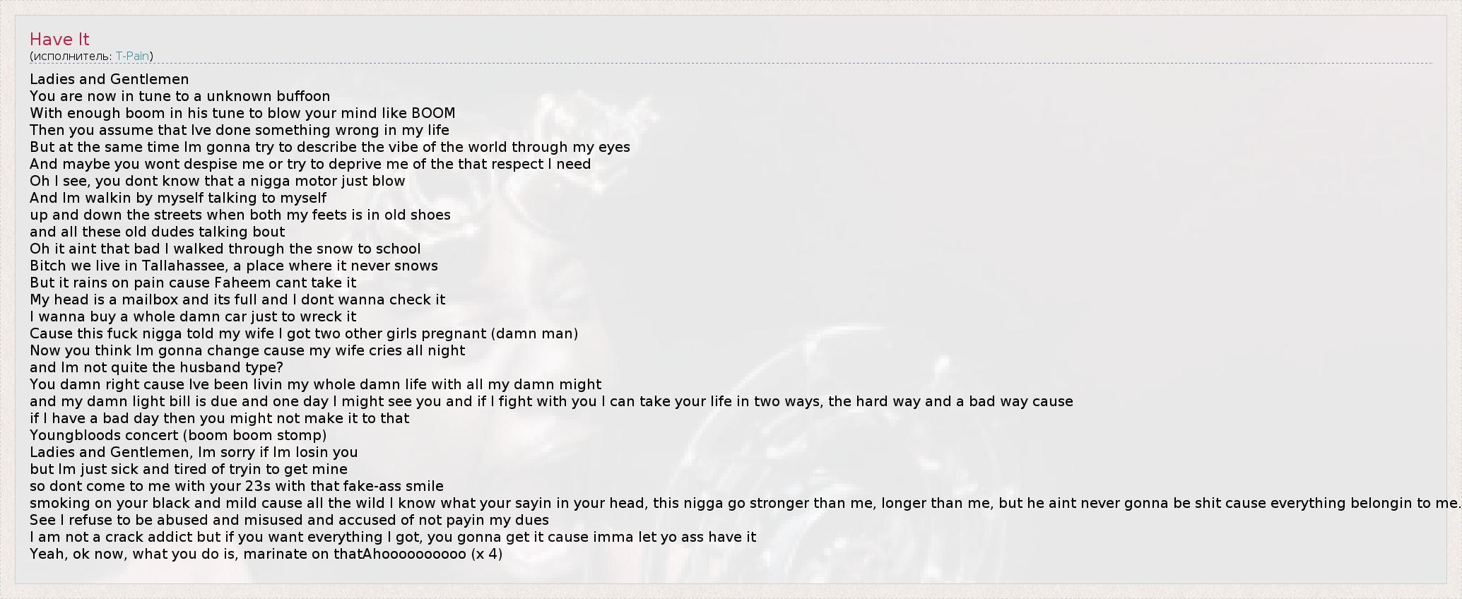 Это интересно:T-Pain, человек-войлочные дреды, подписант лейбла Akon - Konvict Muzik, певец с голосом нежного компьютера и знатный похабник на данный момент поет в трех треках из двадцатки Биллборда и сольная его песня сейчас на первых строчках сразу нескольких хит-парадов. "У меня сейчас примерно тридцать человек, для которых я поработал. - рассказывает певец и битмейкер. - Среди них Chris Brown, Usher, Charlie Wilson, Britney... продолжение
