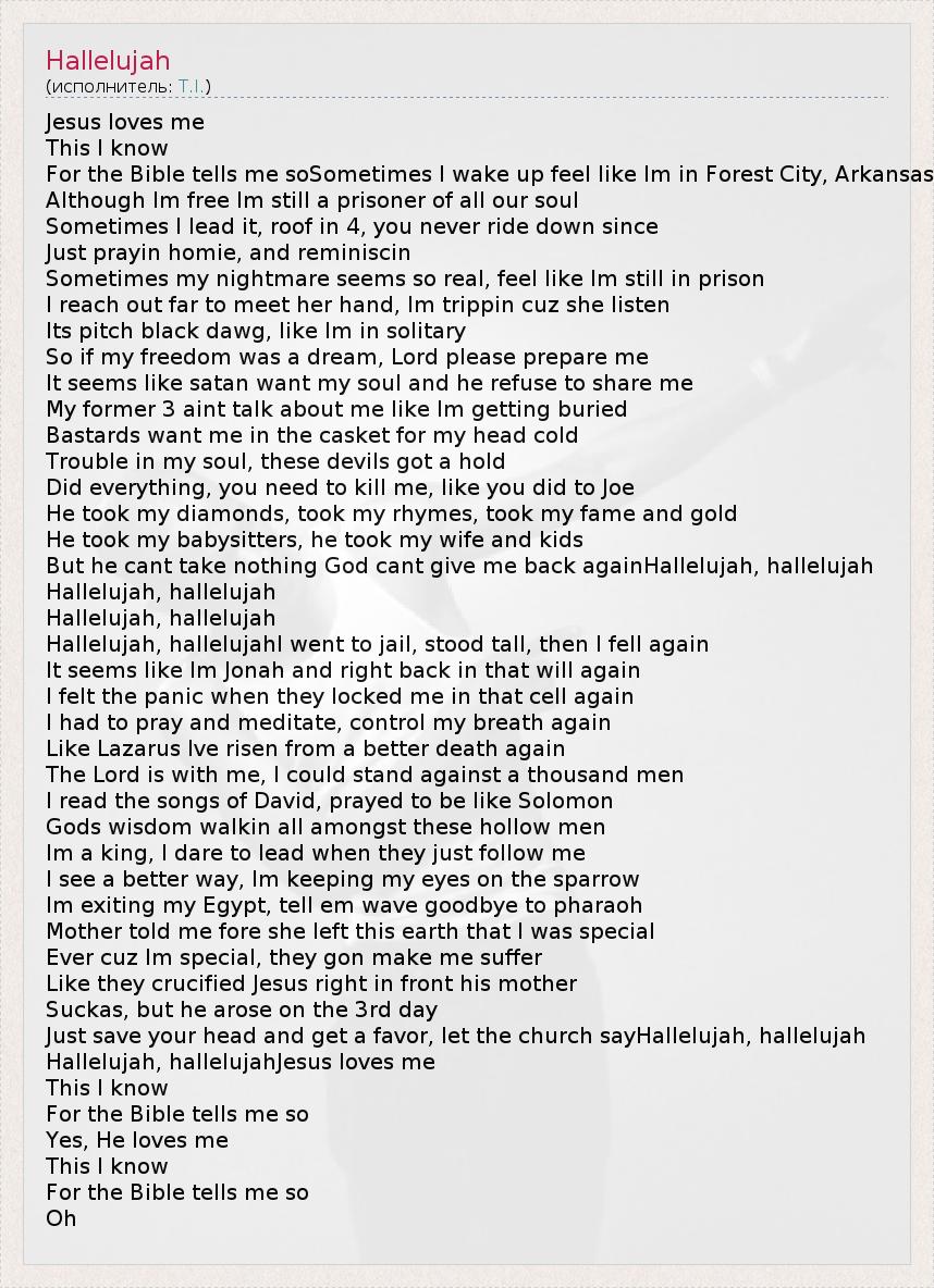 Jesus loves me This I know For the Bible tells me soSometimes I wake up feel like Im in Forest City, Arkansas Although Im free Im still a prisoner of all our soul Sometimes I lead it, roof in 4, you never ride down since Just prayin homie, and reminiscin Sometimes my nightmare seems so real, feel like Im still in prison I reach out far to meet her hand, Im trippin cuz she listen Its pitch black dawg, like Im in solitary So if my freedom was a dream, Lord please prepare me It seems like satan want my soul and he refuse to share me My former 3 aint talk about me like Im getting buried Bastards want me in the casket for my head cold Trouble in my soul, these devils got a hold Did everything, you need to kill me, like you did to Joe He took my diamonds, took my rhymes, took my fame and gold He took my babysitters, he took my wife and kids But he cant take nothing God cant give me back againHallelujah, hallelujah Hallelujah, hallelujah Hallelujah, hallelujah Hallelujah, hallelujahI went to jail, stood tall, then I fell again It seems like Im Jonah and right back in that will again I felt the panic when they locked me in that cell again I had to pray and meditate, control my breath again Like Lazarus Ive risen from a better death again The Lord is with me, I could stand against a thousand men I read the songs of David, prayed to be like Solomon Gods wisdom walkin all amongst these hollow men Im a king, I dare to lead when they just follow me I see a better way, Im keeping my eyes on the sparrow Im exiting my Egypt, tell em wave goodbye to pharaoh Mother told me fore she left this earth that I was special Ever cuz Im special, they gon make me suffer Like they crucified Jesus right in front his mother Suckas, but he arose on the 3rd day Just save your head and get a favor, let the church sayHallelujah, hallelujah Hallelujah, hallelujahJesus loves me This I know For the Bible tells me so Yes, He loves me This I know For the Bible tells me so Oh